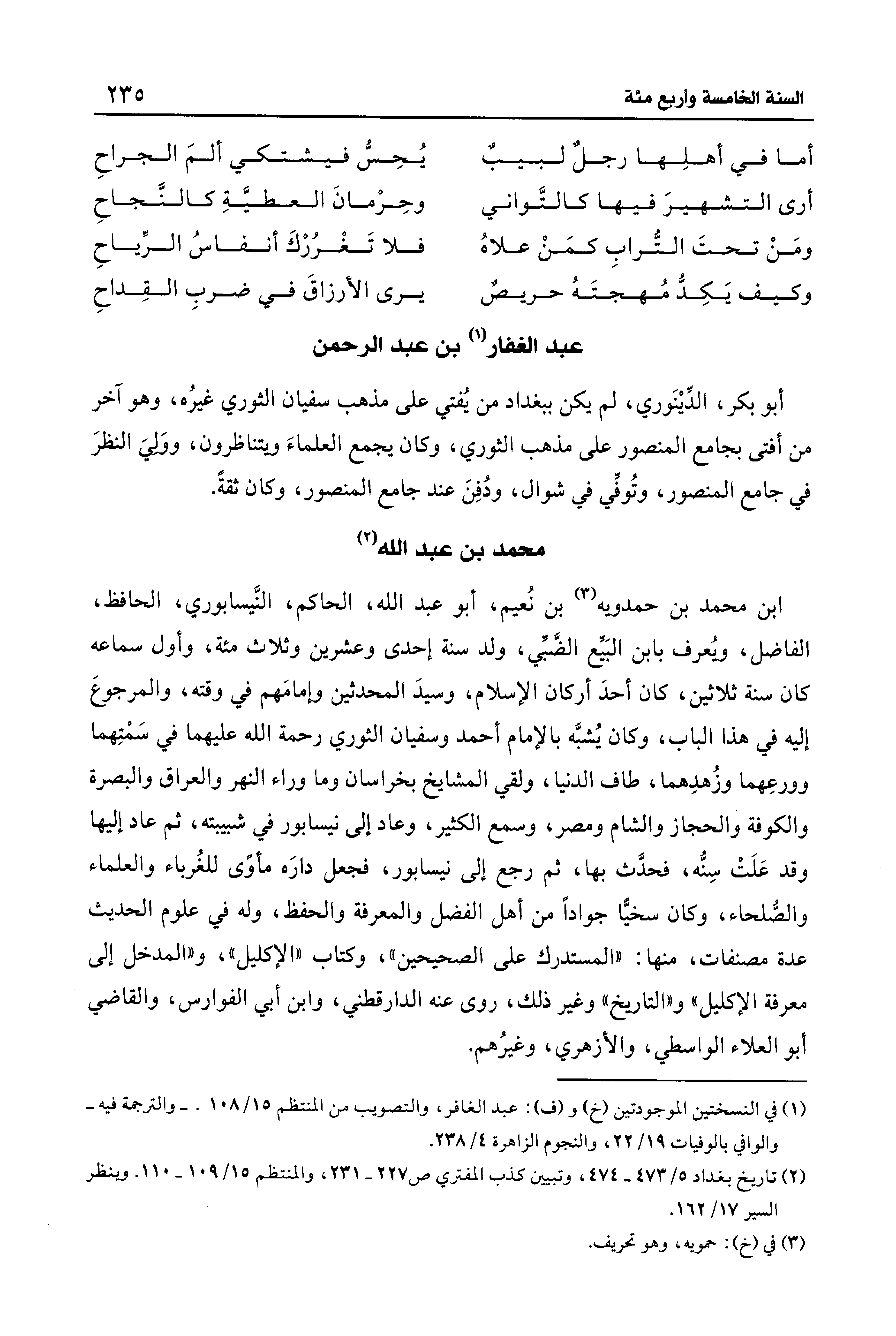 ابن محمد بن حمدويه (¬3) بن نُعيم، أبو عبد الله، الحاكم، النَّيسابوري، الحافظ، الفاضل، ويعرف بابن البَيِّع الضَّبِّي، ولد سنة إحدى وعشرين وثلاث مئة، وأول سماعه كان سنة ثلاثين، كان أحدَ أركان الإسلام، وسيدَ المحدثين وإمامَهم فِي وقته، والمرجوعَ إليه فِي هذا الباب، وكان يُشبَّه بالإمام أحمد وسفيان الثوري رحمة الله عليهما فِي سَمْتِهما وورعِهما وزُهدِهما، طاف الدنيا، ولقي المشايخ بخراسان وما وراء النهر والعراق والبصرة والكوفة والحجاز والشام ومصر، وسمع الكثير، وعاد إلى نيسابور فِي شبيبته، ثم عاد إليها وقد عَلَتْ سِنُّه، فحدَّث بها، ثم رجع إلى نيسابور، فجعل دارَه مأوًى للغُرباء والعلماء والصُّلحاء، وكان سخيًّا جوادًا من أهل الفضل والمعرفة والحفظ، وله فِي علوم الحديث عدة مصنفات، منها: "المستدرك على الصحيحين"، وكتاب "الإكليل"، و"المدخل إلى معرفة الإكليل" و"التاريخ" وغير ذلك، روى عنه الدارقطني، وابن أبي الفوارس، والقاضي أبو العلاء الواسطي، والأزهري، وغيرُهم.