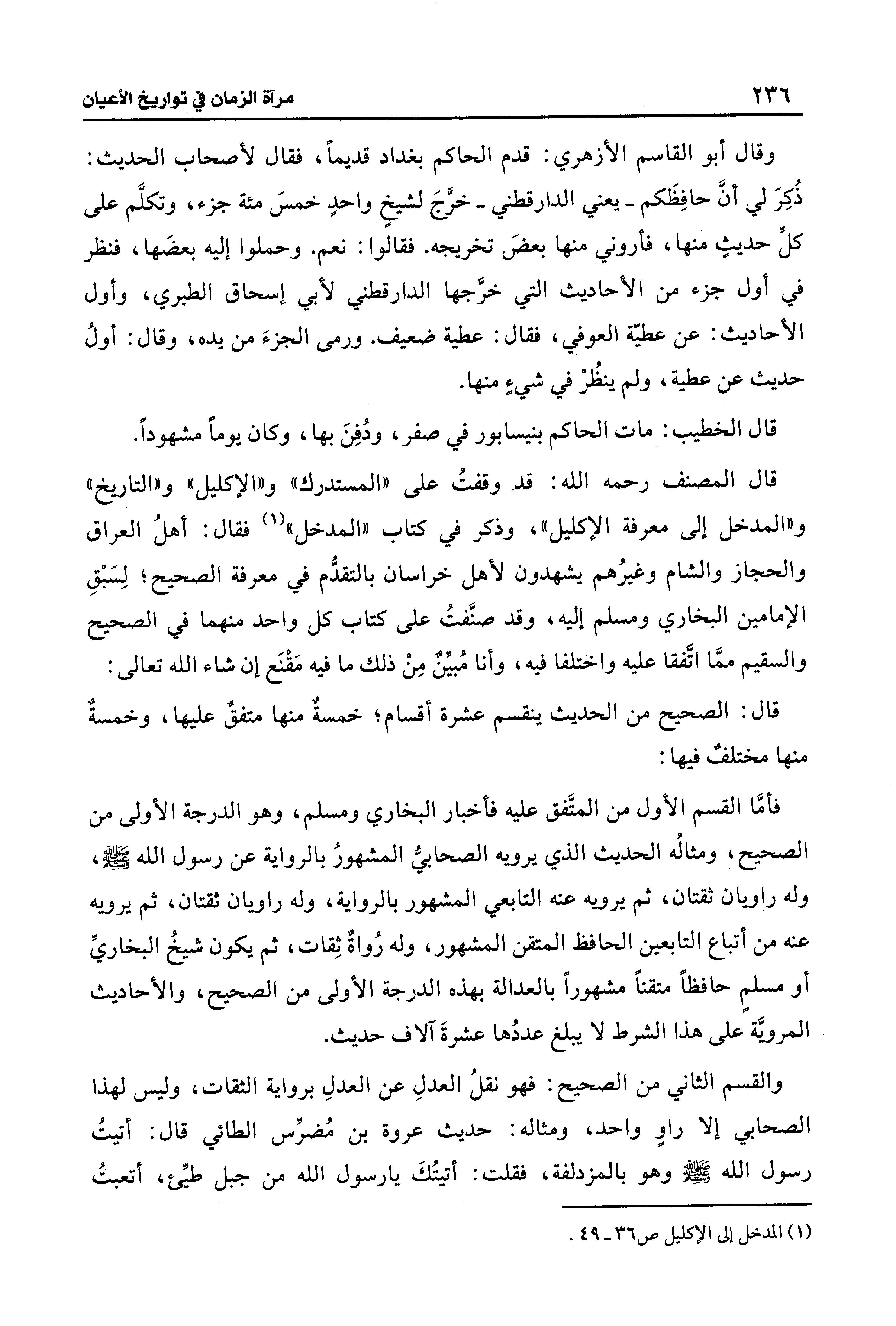 قال المصنف رحمه الله: قد وقفتُ على "المستدرك " و"الإكليل" و"التاريخ" و"المدخل إلى معرفة الإكليل"، وذكر فِي كتاب "المدخل" (¬1) فقال: أهلُ العراق والحجاز والشام وغيرُهم يشهدون لأهل خراسان بالتقدُّم فِي معرفة الصحيح؛ لِسَبْقِ الإمامين البخاري ومسلم إليه، وقد صنَّفتُ على كتاب كل واحد منهما فِي الصحيح والسقيم ممَّا اتَّفقا عليه واختلفا فيه، وأنا مُبيِّنٌ مِنْ ذلك ما فيه مَقْنَع إن شاء الله تعالى: