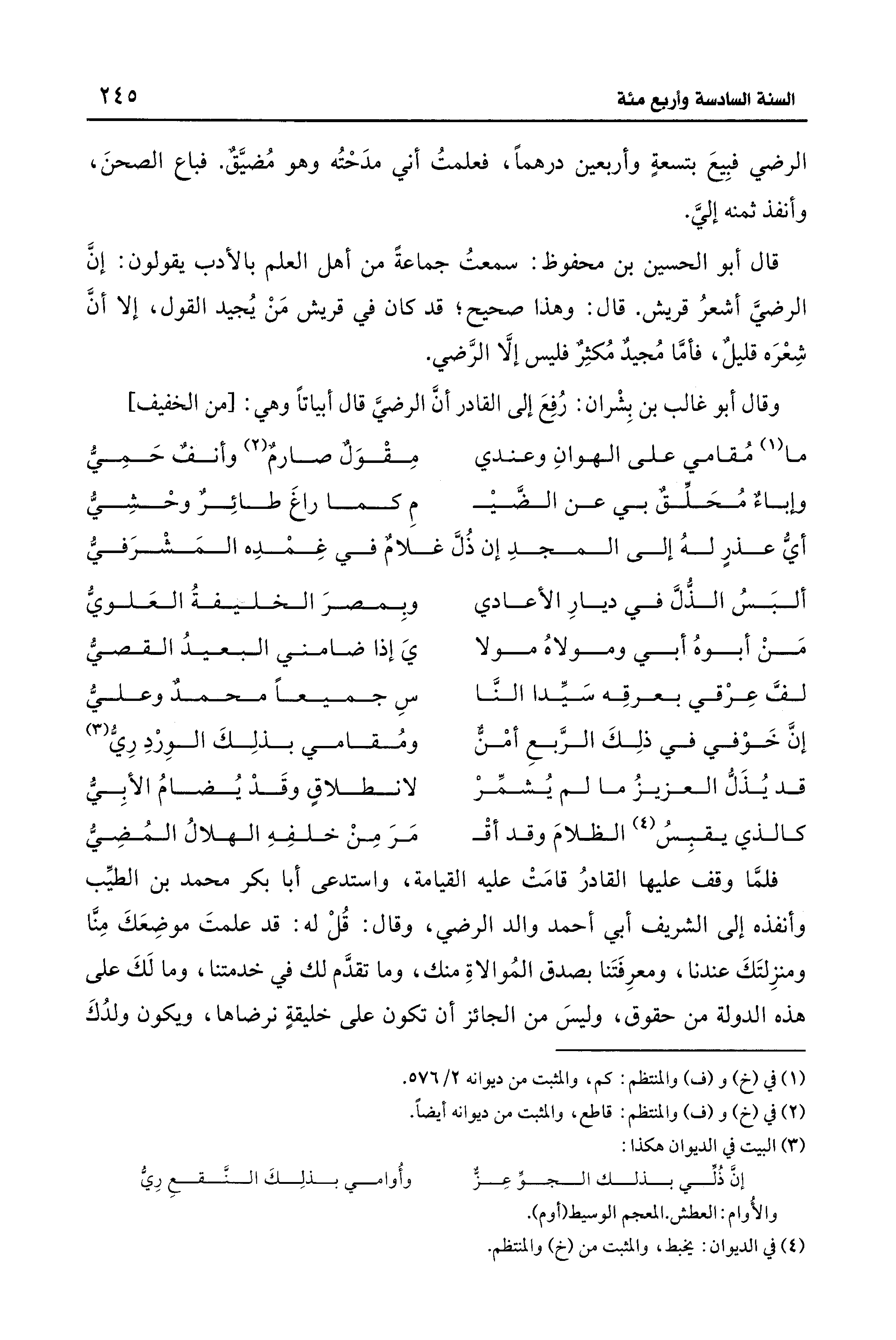 فلمَّا وقف عليها القادرُ قامَتْ عليه القيامة، واستدعى أبا بكر محمد بن الطيِّب وأنفذه إلى الشريف أبي أحمد والد الرضي، وقال: قُلْ له: قد علمتَ موضِعَكَ مِنَّا ومنزِلتَكَ عندنا، ومعرِفَتَنا بصدق المُوالاةِ منك، وما تقدَّم لك فِي خدمتنا، وما لَكَ على هذه الدولة من حقوق، وليسَ من الجائز أن تكون على خليقةٍ نرضاها، ويكون ولدُكَ