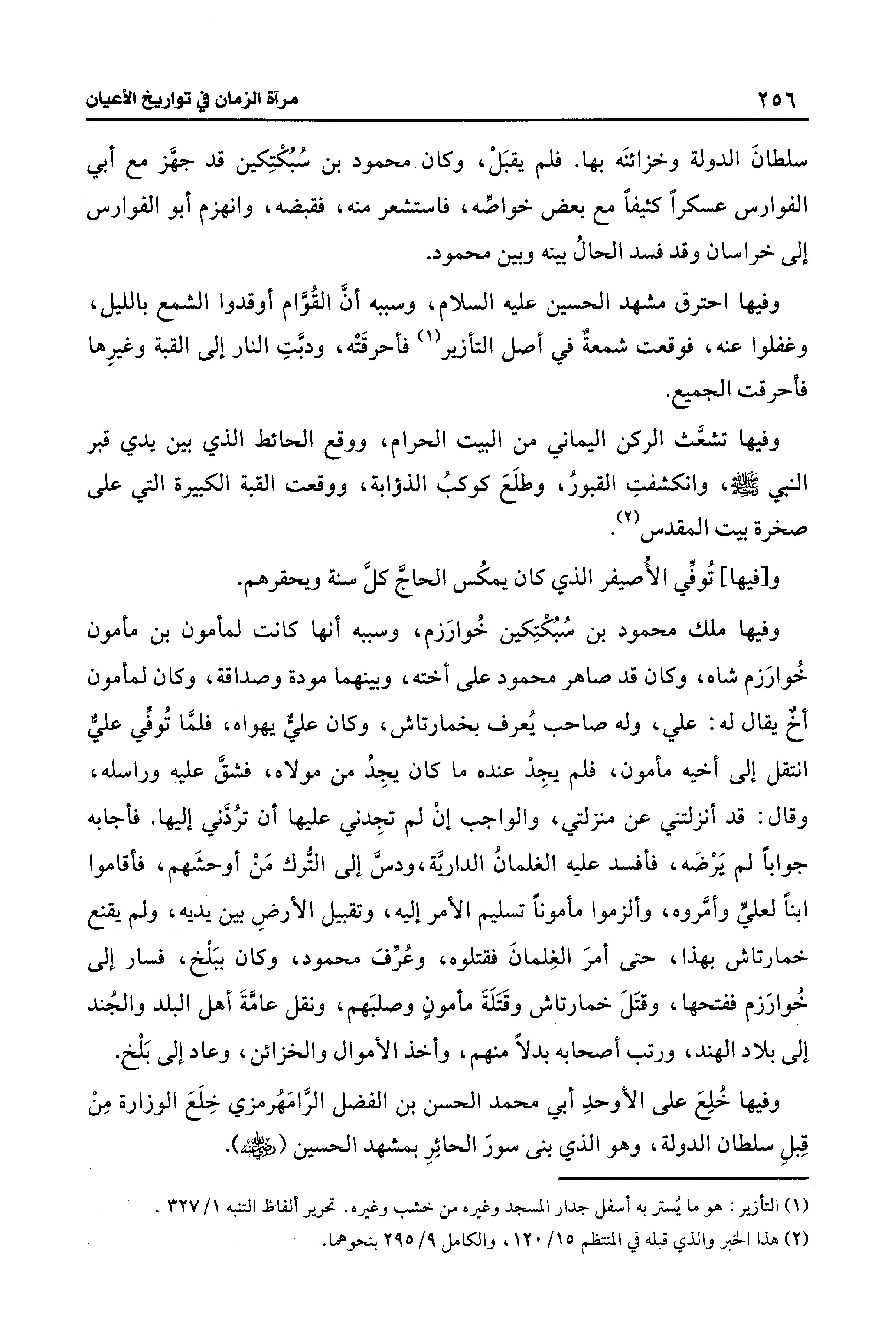 وفيها احترق مشهد الحسين - عليه السلام -، وسببه أنَّ القُوَّام أوقدوا الشمع بالليل، وغفلوا عنه، فوقعت شمعةٌ في أصل التأزير (¬1) فأحرقَتْه، ودبَّتِ النار إلى القبة وغيرِها فأحرقت الجميع.