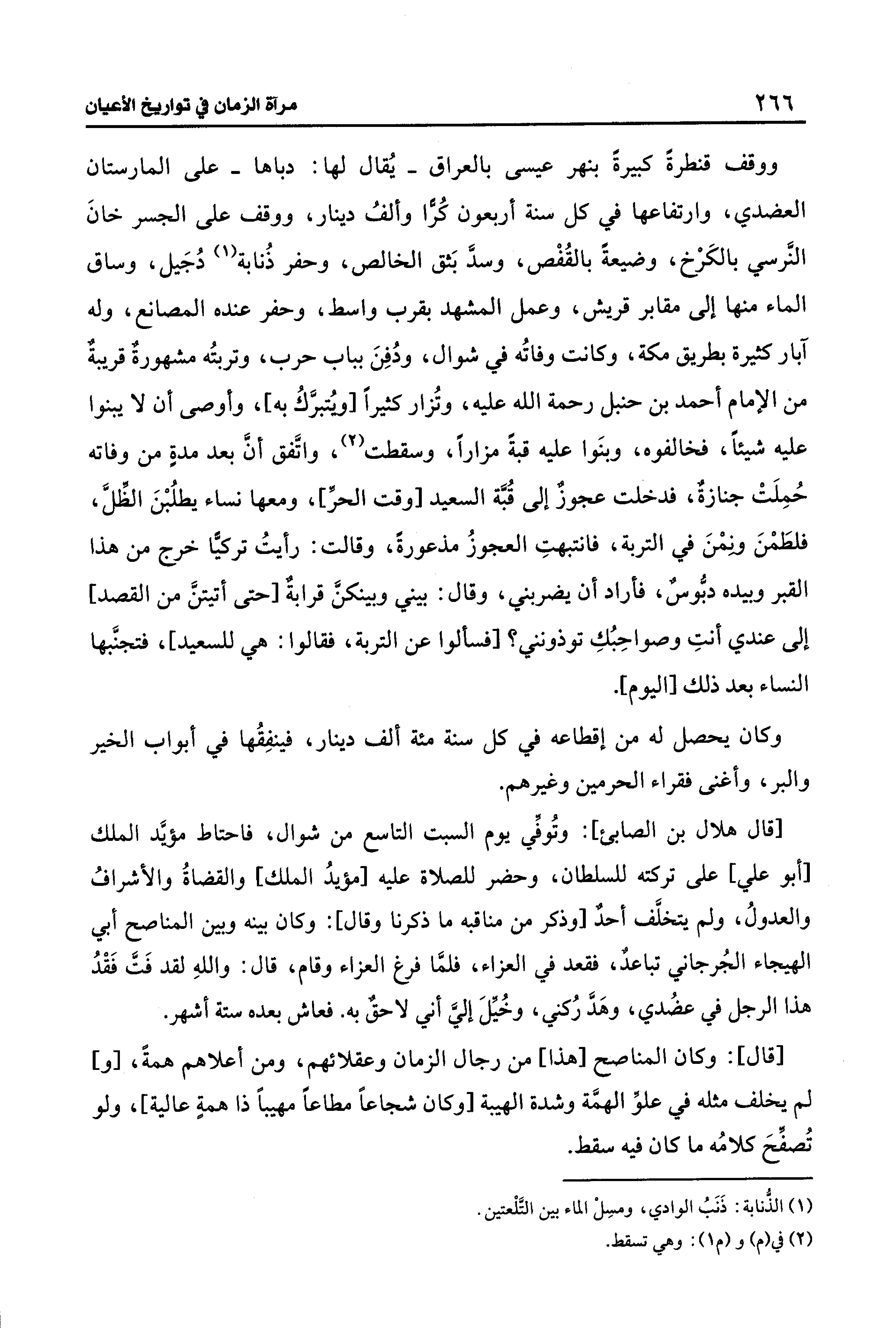 ووقف قنطرةً كبيرةً بنهر عيسى بالعراق -يُقال لها: دباها- على المارستان العضدي، وارتفاعها في كل سنة أربعون كُرًّا وألفُ دينار، ووقف على الجسر خانَ النرسي بالكَرْخ، وضيعةً بالقُفْص، وسدَّ بَثق الخالص، وحفر ذُنابة (¬1) دُجَيل، وساق الماء منها إلى مقابر قريش، وعمل المشهد بقرب واسط، وحفر عنده المصانع، وله آبار كثيرة بطريق مكة، وكانت وفاتُه في شوال، ودُفِنَ بباب حرب، وتربتُه مشهورة قريبة من الإمام أحمد بن حنبل رحمة الله عليه، وتُزار كثيرًا [ويتبركُ به]، وأوصى أن لا يبنوا عليه شيئًا، فخالفوه، وبنَوا عليه قبةً مزارًا، وسقطت (¬2)، واتَّفق أنَّ بعد مدةٍ من وفاته حُمِلَتْ جنازةٌ، فدخلت عجوزٌ إلى قُبَّة السعيد [وقت الحر]، ومعها نساء يطلُبْنَ الظِّلَّ، فلطَمْنَ ونِمْنَ في التربة، فانتبهتِ العجوزُ مذعورةً، وقالت: رأيتُ تركيًّا خرج من هذا القبر وبيده دبُّوسٌ، فأراد أن يضربني، وقال: بيني وبينكن قرابة [حتى أتيتنَّ من القصد] إلى عندي أنتِ وصواحِبُكِ توذونني؟ [فسألوا عن التربة، فقالوا: هي للسعيد]، فتجنَّبها النساء بعد ذلك [اليوم].