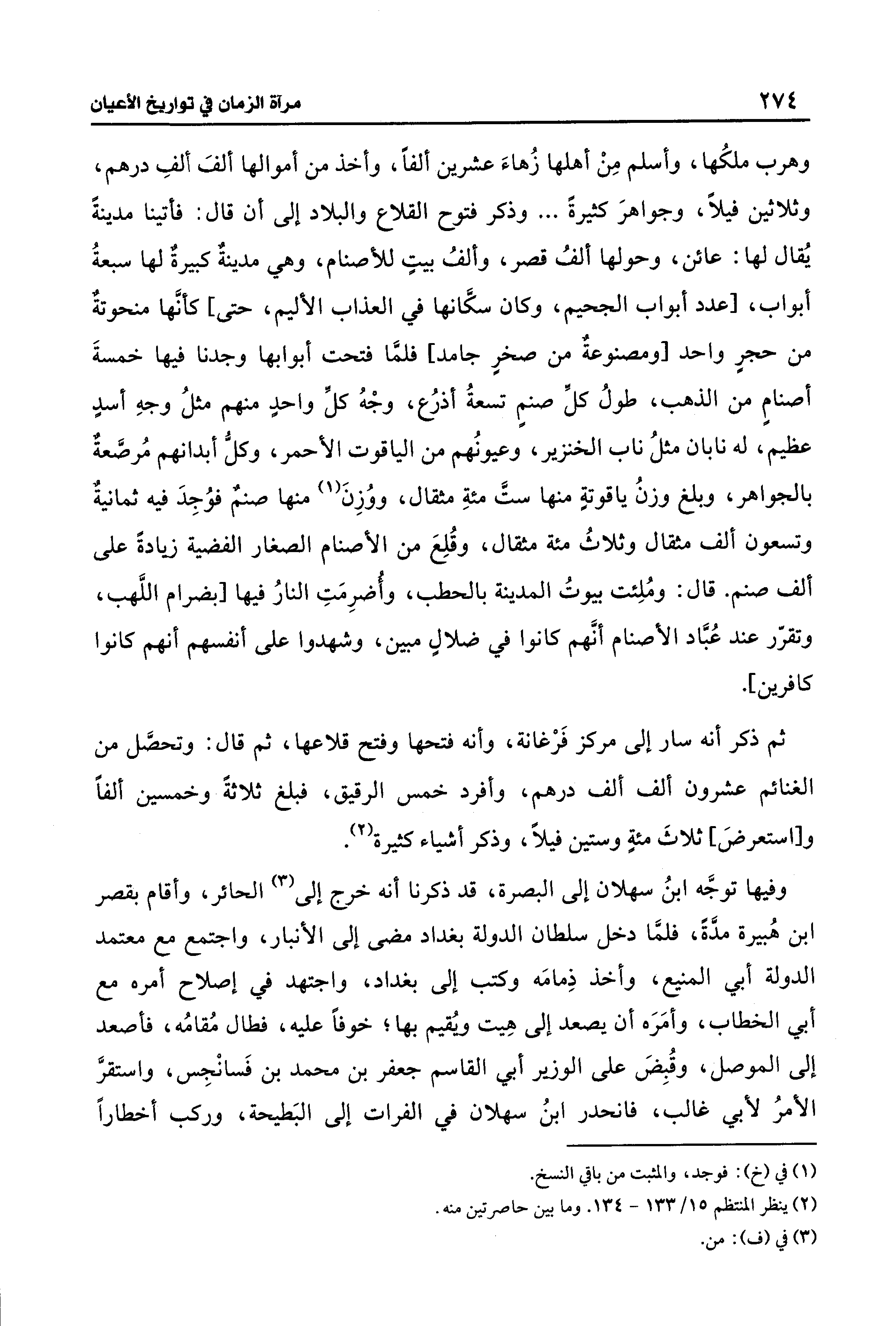 وهرب ملكُها، وأسلم مِنْ أهلها زُهاءَ عشرين ألفًا، وأخذ من أموالها ألفَ ألفِ درهم، وثلاثين فيلًا، وجواهرَ كثيرةً ... وذكر فتوح القلاع والبلاد إلى أن قال: فأتينا مدينةً يُقال لها: عائن، وحولها ألفُ قصر، وألفُ بيتٍ للأصنام، وهي مدينة كبيرة لها سبعةُ أبواب، [عدد أبواب الجحيم، وكان سكَّانها في العذاب الأليم، حتى] كانَّها منحوتة من حجرٍ واحد [ومصنوعة من صخرٍ جامد] فلمَّا فتحت أبوابها وجدنا فيها خمسةَ أصنامٍ من الذهب، طولُ كلِّ صنمٍ تسعةُ أذرُع، وجْهُ كلِّ واحدٍ منهم مثلُ وجهِ أسدٍ عظيم، له نابان مثلُ ناب الخنزير، وعيونُهم من الياقوت الأحمر، وكلُّ أبدانهم مُرصَّعة بالجواهر، وبلغ وزنُ ياقوتة منها ستَّ مئةِ مثقال، ووُزِنَ (¬1) منها صنم فوُجِدَ فيه ثمانية وتسعون ألف مثقال وثلاثُ مئة مثقال، وقُلِعَ من الأصنام الصغار الفضية زيادةً على ألف صنم. قال: ومُلِئت بيوتُ المدينة بالحطب، واضرِمَتِ النارُ فيها [بضرام اللهب، وتقرّر عند عُبَّاد الأصنام أنَّهم كانوا في ضلالٍ مبين، وشهدوا على أنفسهم أنهم كانوا كافرين].