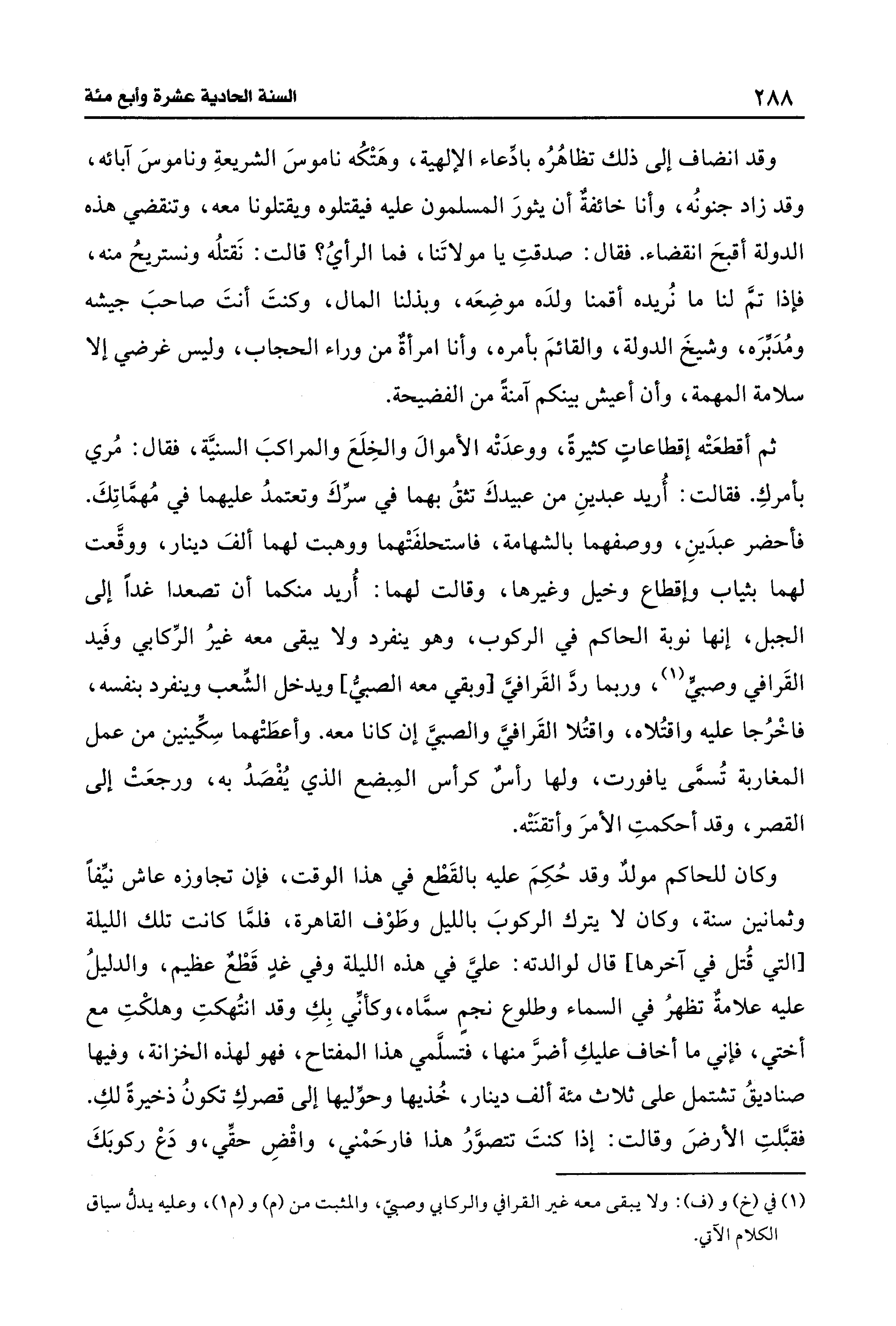 وقد انضاف إلى ذلك تظاهُرُه بادِّعاء الإلهية، وهَتْكُه ناموسَ الشريعةِ وناموسَ آبائه، وقد زاد جنونُه، وأنا خائفةٌ أن يثورَ المسلمون عليه فيقتلوه ويقتلونا معه، وتنقضي هذه الدولة أقبحَ انقضاء. فقال: صدقتِ يا مولاتَنا، فما الرأيُ؟ قالت: نَقتلُه ونستريحُ منه، فإذا تمَّ لنا ما نُريده أقمنا ولدَه موضِعَه، وبذلنا المال، وكنتَ أنتَ صاحبَ جيشه ومُدَبِّرَه، وشيخَ الدولة، والقائمَ بأمره، وأنا امرأةٌ من وراء الحجاب، وليس غرضي إلا سلامة المهمة، وأن أعيش بينكم آمنةً من الفضيحة.