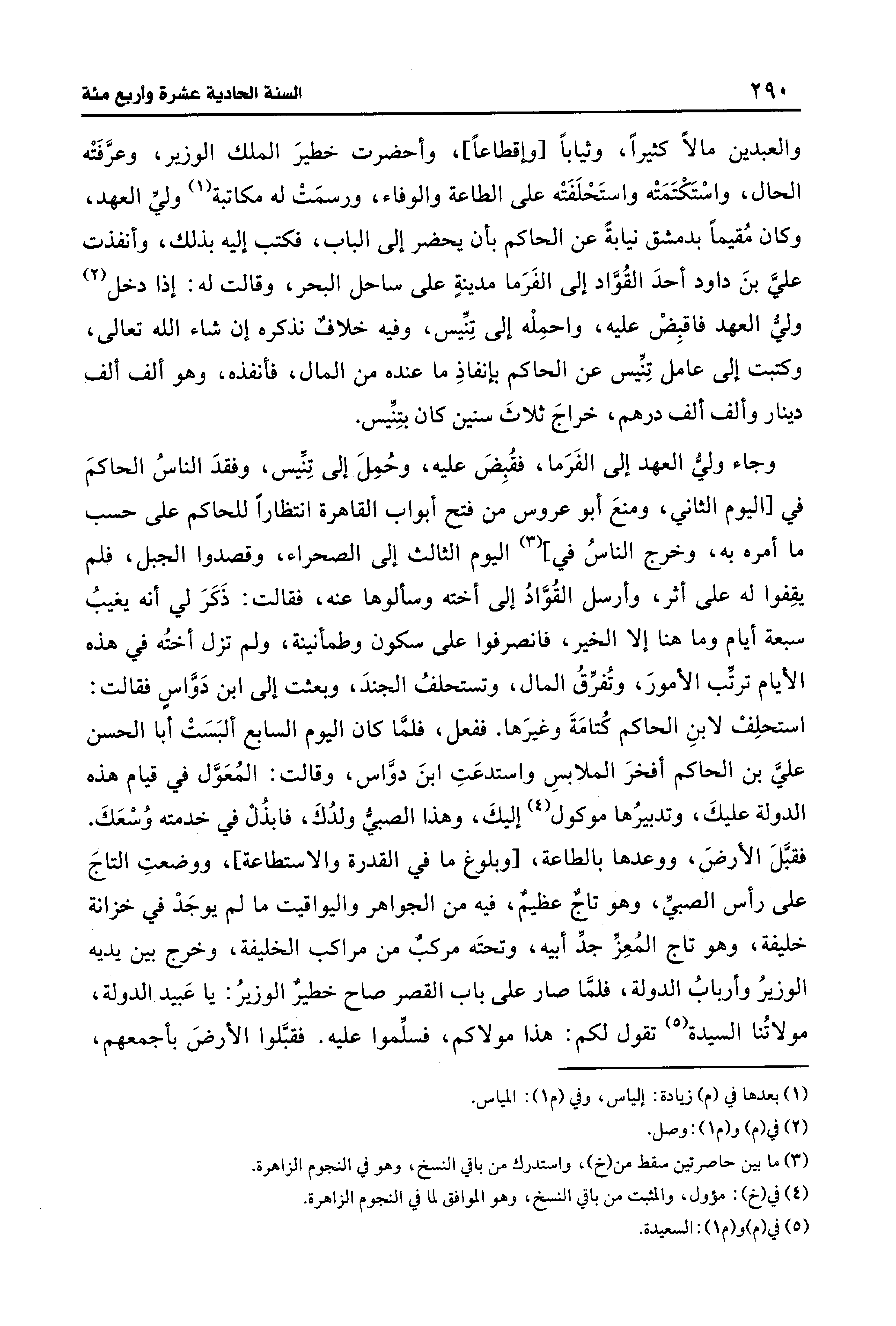وجاء وليُّ العهد إلى الفَرَما، فقُبِضَ عليه، وحُمِلَ إلى تِنِّيس، وفقدَ الناسُ الحاكمَ في [اليوم الثاني، ومنعَ أبو عروس من فتح أبواب القاهرة انتظارًا للحاكم على حسب ما أمره به، وخرج الناسُ في] (¬3) اليوم الثالث إلى الصحراء، وقصدوا الجبل، فلم يقِفوا له على أثر، وأرسل القُوَّادُ إلى أخته وسألوها عنه، فقالت: ذَكرَ لي أنه يغيبُ سبعة أيام وما هنا إلا الخير، فانصرفوا على سكون وطمأنينة، ولم تزل أختُه في هذه الأيام ترتِّب الأمورَ، وتُفرِّقُ المال، وتستحلفُ الجندَ، وبعثت إلى ابن دَوَّاسٍ فقالت: استحلِفْ لابنِ الحاكم كُتامَةَ وغيرَها. ففعل، فلمَّا كان اليوم السابع ألبَسَتْ أبا الحسن عليَّ بن الحاكم أفخرَ الملابسِ واستدعَتِ ابنَ دواس، وقالت: المُعَوَّل في قيام هذه الدولة عليكَ، وتدبيرُها موكول (¬4) إليكَ، وهذا الصبيُّ ولدُكَ، فابذُلْ في خدمته وُسْعَكَ. فقبَّلَ الأرضَ، ووعدها بالطاعة، [وبلوغ ما في القدرة والاستطاعة]، ووضعتِ التاجَ على رأس الصبي، وهو تاجٌ عظيمٌ، فيه من الجواهر واليواقيت ما لم يوجَدْ في خزانة خليفة، وهو تاج المُعِزِّ جدِّ أبيه، وتحتَه مركبٌ من مراكب الخليفة، وخرج بين يديه الوزيرُ وأربابُ الدولة، فلما صار على باب القصر صاح خطيرٌ الوزيرُ: يا عَبيد الدولة، مولاتُنا السيدة (¬5) تقول لكم: هذا مولاكم، فسلِّموا عليه. فقبَّلوا الأرضَ بأجمعهم،