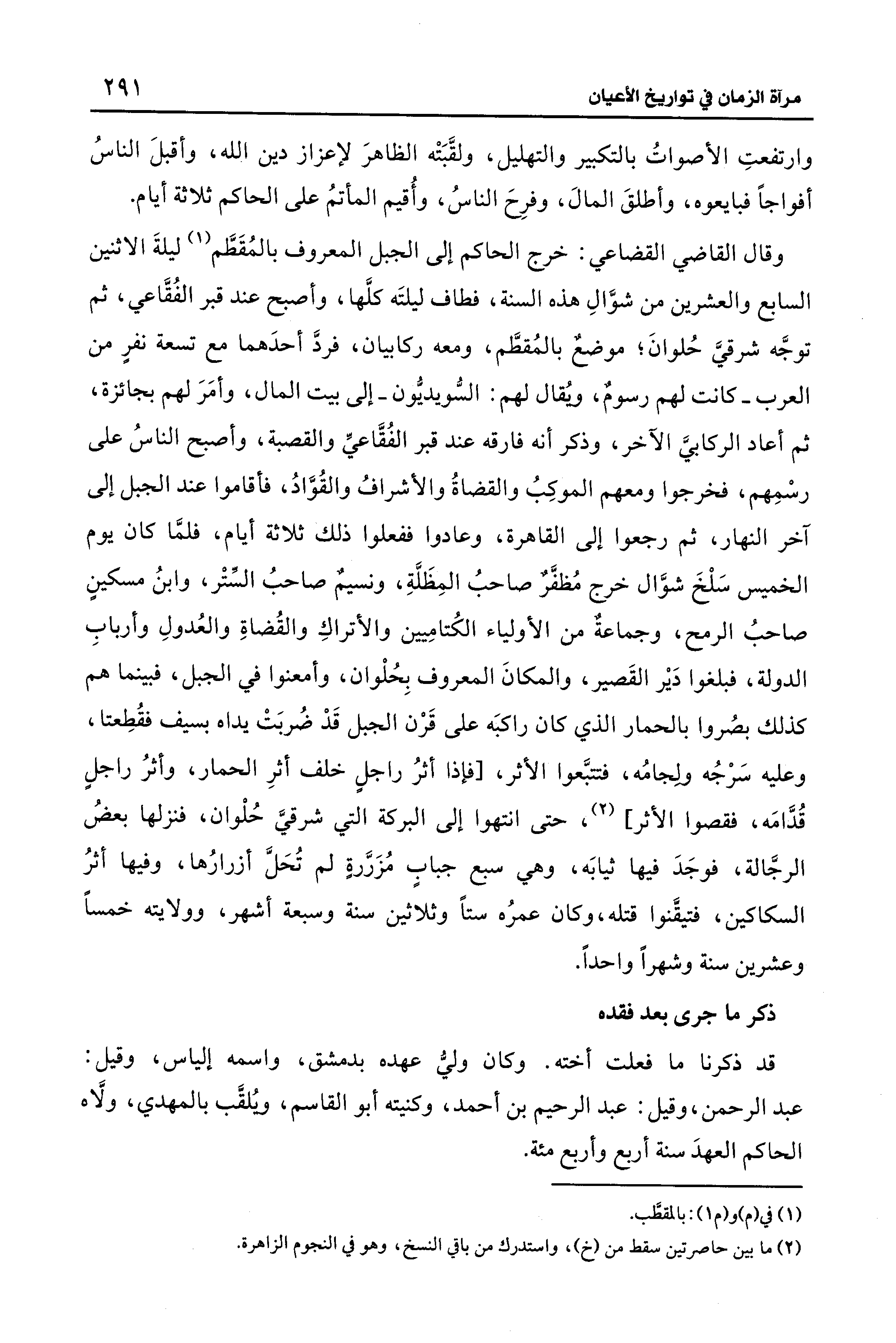 وقال القاضي القضاعي: خرج الحاكم إلى الجبل المعروف بالمُقَطَّم (¬1) ليلةَ الاثنين السابع والعشرين من شوَّالِ هذه السنة، فطاف ليلتَه كلَّها، وأصبح عند قبر الفُقَّاعي، ثم توجَّه شرقيَّ حُلوانَ؛ موضعٌ بالمُقطَّم، ومعه ركابيان، فردَّ أحدَهما مع تسعة نفرٍ من العرب -كانت لهم رسومٌ، ويُقال لهم: السُّويديُّون- إلى بيت المال، وأمَرَ لهم بجائزة، ثم أعاد الركابيَّ الآخر، وذكر أنه فارقه عند قبر الفُقَّاعي والقصبة، وأصبح الناسُ على رسْمِهم، فخرجوا ومعهم الموكِبُ والقضاةُ والأشرافُ والقُوَّادُ، فأقاموا عند الجبل إلى آخر النهار، ثم رجعوا إلى القاهرة، وعادوا ففعلوا ذلك ثلاثة أيام، فلمَّا كان يوم الخميس سَلْخَ شوَّال خرج مُظفَّرٌ صاحبُ المِظَفَةِ، ونسيمٌ صاحبُ السّتْر، وابنُ مسكينٍ صاحبُ الرمح، وجماعةٌ من الأولياء الكُتامِيين والأتراكِ والقُضاةِ والعُدولِ وأربابِ الدولة، فبلغوا دَيْر القَصير، والمكانَ المعروف بِحُلْوان، وأمعنوا في الجبل، فبينما هم كذلك بصُروا بالحمار الذي كان راكبَه على قَرْن الجبل قَدْ ضُربَتْ يداه بسيف فقُطِعتا، وعليه سَرْجُه ولجامُه، فتتبَّعوا الأثر، [فإذا أثرُ راجلٍ خلف أثرِ الحمار، وأثرُ راجلٍ قُدَّامَه، فقصوا الأثر] (¬2)، حتى انتهوا إلى البركة التي شرقي حُلْوان، فنزلها بعضُ الرجَّالة، فوجَدَ فيها ثيابَه، وهي سبع جبابٍ مُزَرَّرةٍ لم تُحَلَّ أزرارُها، وفيها أثرُ السكاكين، فتيقنوا قتله، وكان عمرُه ستًّا وثلاثين سنة وسبعة أشهر، وولايته خمسًا وعشرين سنة وشهرًا واحدًا.