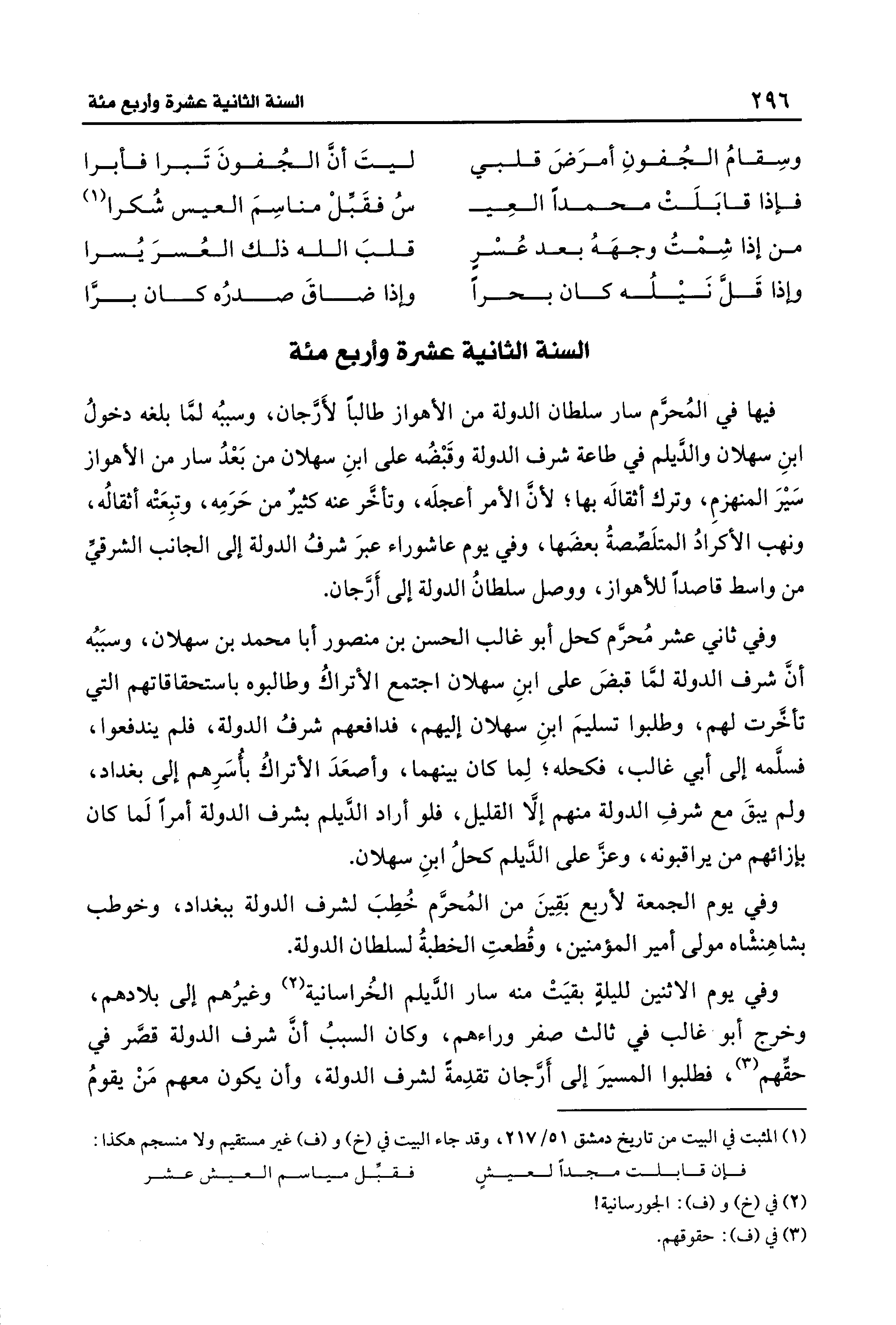 فيها في المُحرَّم سار سلطان الدولة من الأهواز طالبًا لأَرَّجان، وسببُه لمَّا بلغه دخولُ ابنِ سهلان والدَّيلم في طاعة شرف الدولة وقَبْضُه على ابنِ سهلان من بَعْدُ سار من الأهواز سَيرَ المنهزمِ، وترك أثقاله بها؛ لأنَّ الأمر أعجلَه، وتأخَّر عنه كثيرٌ من حَرَمِه، وتبِعَتْه أثقالُه، ونهب الأكرادُ المتلَصِّصةُ بعضَها، وفي يوم عاشوراء عبرَ شرفُ الدولة إلى الجانب الشرقيِّ من واسط قاصدًا للأهواز، ووصل سلطانُ الدولة إلى أَرَّجان.