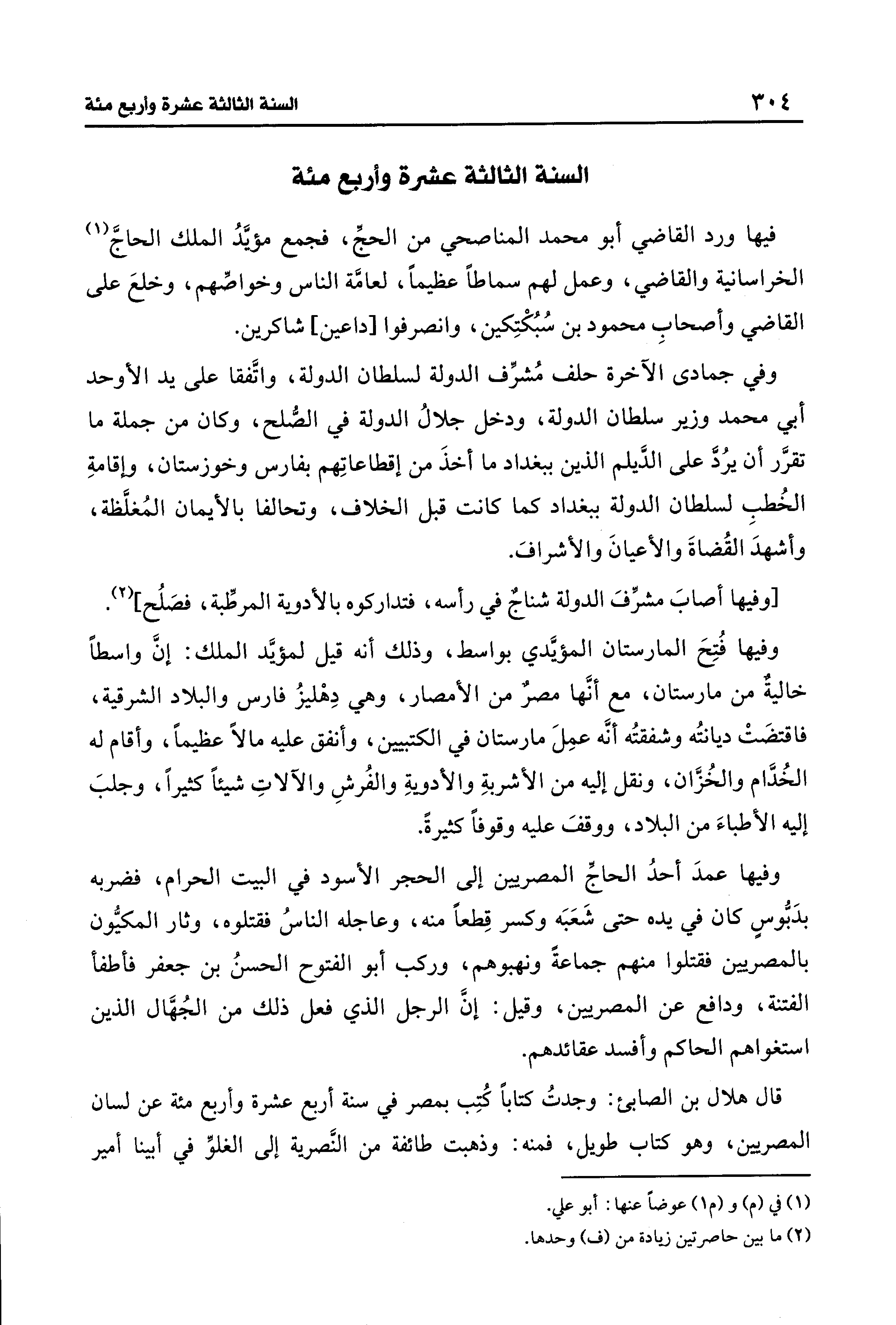 فيها ورد القاضي أبو محمد المناصحي من الحجِّ، فجمع مؤيَّدُ الملك الحاجَّ (¬1) الخراسانية والقاضي، وعمل لهم سماطًا عظيمًا، لعامَّة الناس وخواصِّهم، وخلعَ على القاضي وأصحابِ محمود بن سُبُكْتِكين، وانصرفوا [داعين] شاكرين.
