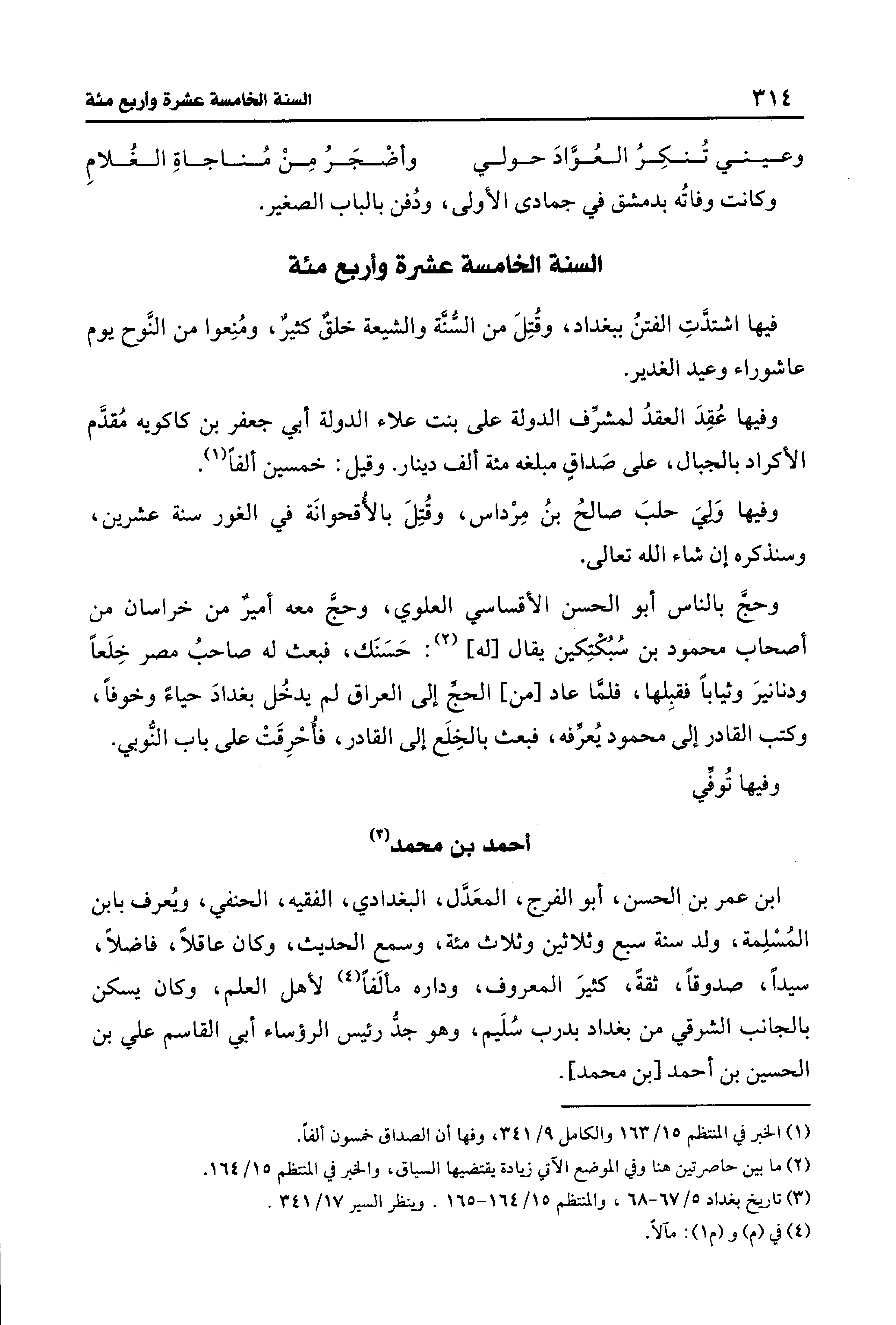 فيها اشتدَّتِ الفتنُ ببغداد، وقُتِلَ من السُّنَّة والشيعة خلقٌ كثيرٌ، ومُنِعوا من النَّوح يوم عاشوراء وعيد الغدير.