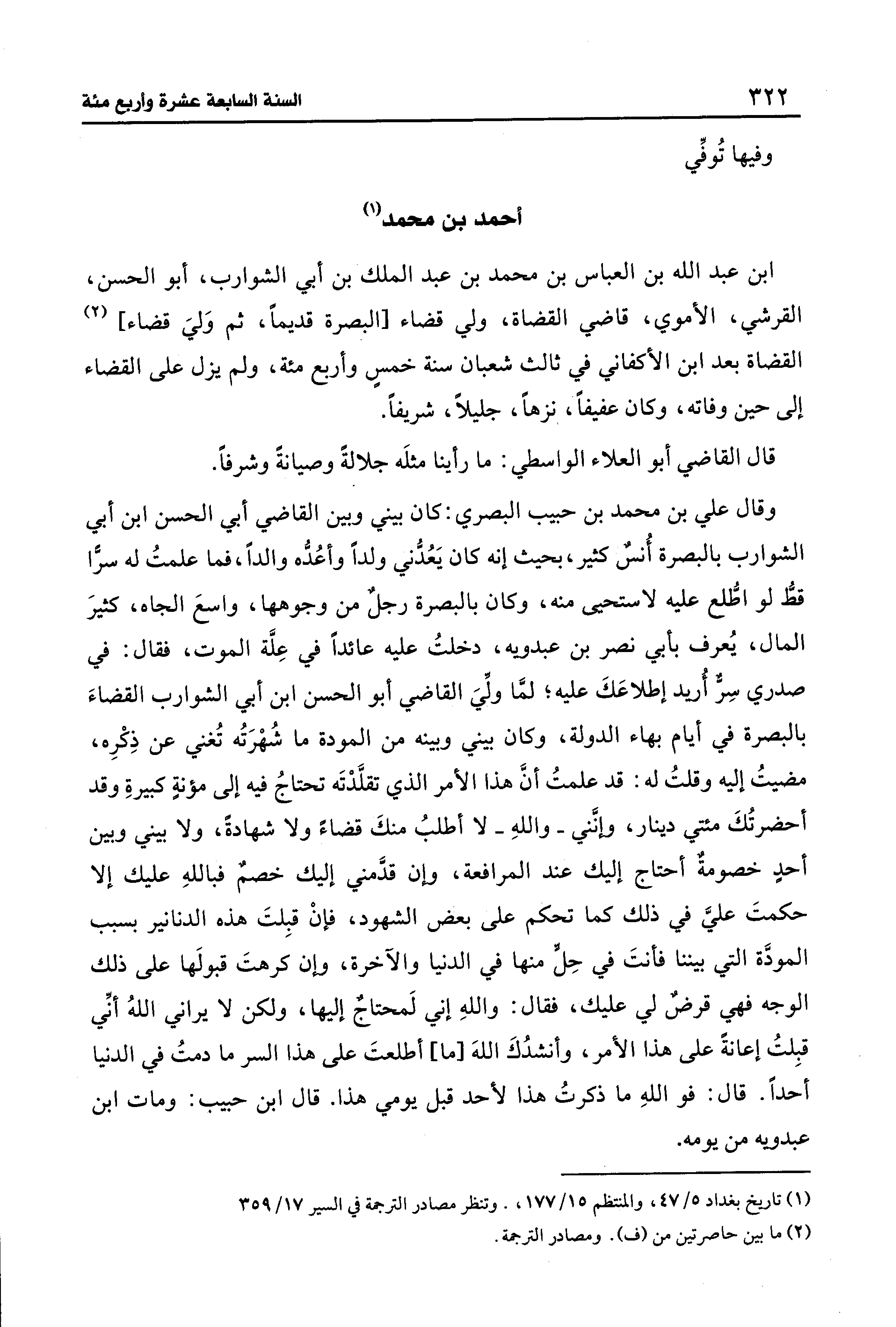 ابن عبد الله بن العباس بن محمد بن عبد الملك بن أبي الشوارب، أبو الحسن، القرشي، الأموي، قاضي القضاة، ولي قضاء [البصرة قديمًا، ثم وَليَ قضاء] (¬2) القضاة بعد ابن الأكفاني في ثالث شعبان سنة خمسٍ وأربع مئة، ولم يزل على القضاء إلى حين وفاته، وكان عفيفًا، نزهًا، جليلًا، شريفًا.