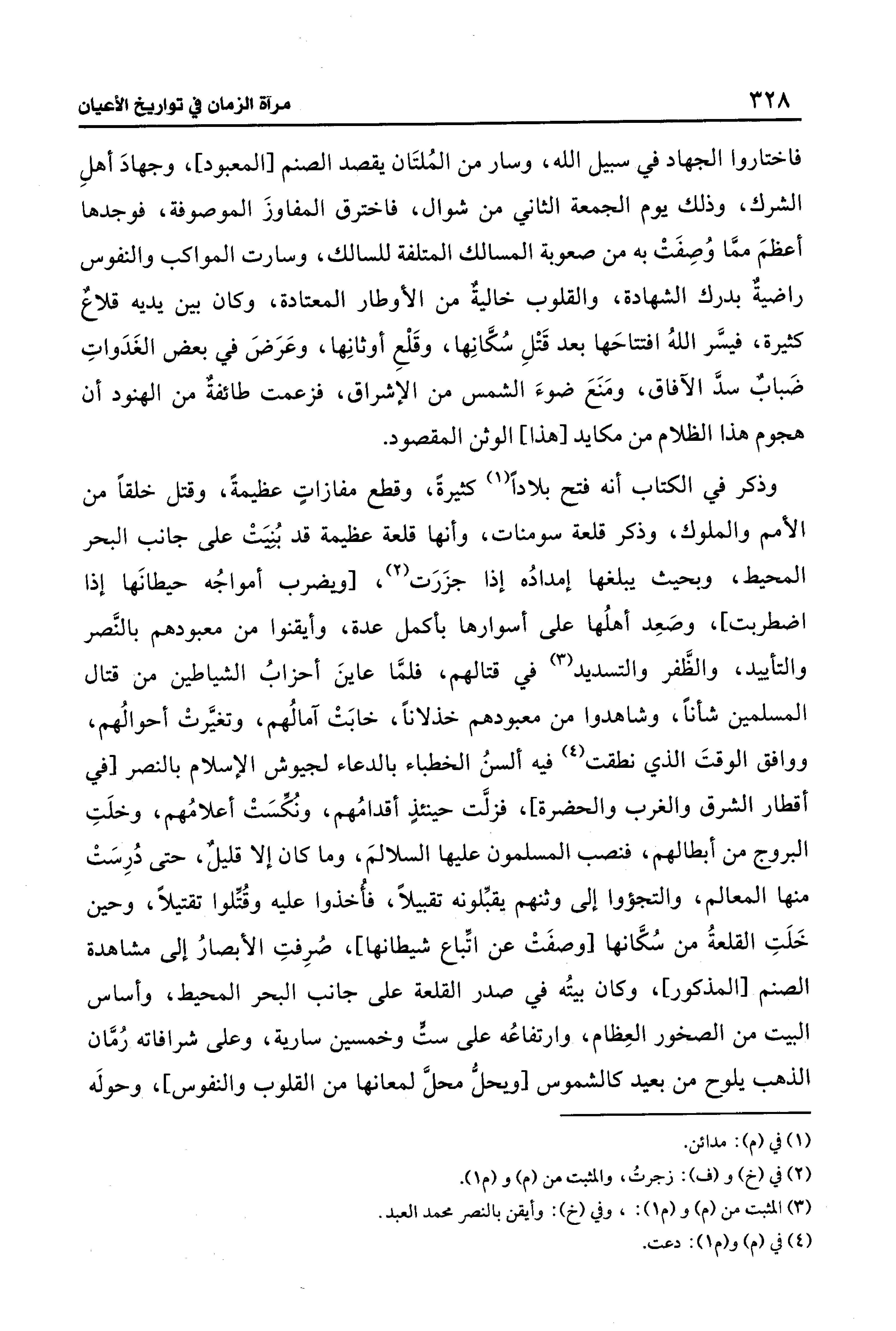 فاختاروا الجهاد في سبيل الله، وسار من المُلتَان يقصد الصنم [المعبود]، وجهادَ أهلِ الشرك، وذلك يوم الجمعة الثاني من شوال، فاخترق المفاوزَ الموصوفة، فوجدها أعظمَ ممَّا وُصِفَتْ به من صعوبة المسالك المتلفة للسالك، وسارت المواكب والنفوس راضيةٌ بدرك الشهادة، والقلوب خاليةٌ من الأوطار المعتادة، وكان بين يديه قلاع كثيرة، فيسَّر اللهُ افتتاحَها بعد قَتْلِ سُكَّانِها، وقَلْعِ أوثانِها، وعَرَضَ في بعض الغَدَواتِ ضَبابٌ سدَّ الآفاق، ومَنَعَ ضوءَ الشمس من الإشراق، فزعمت طائفةٌ من الهنود أن هجوم هذا الظلام من مكايد [هذا] الوثن المقصود.
