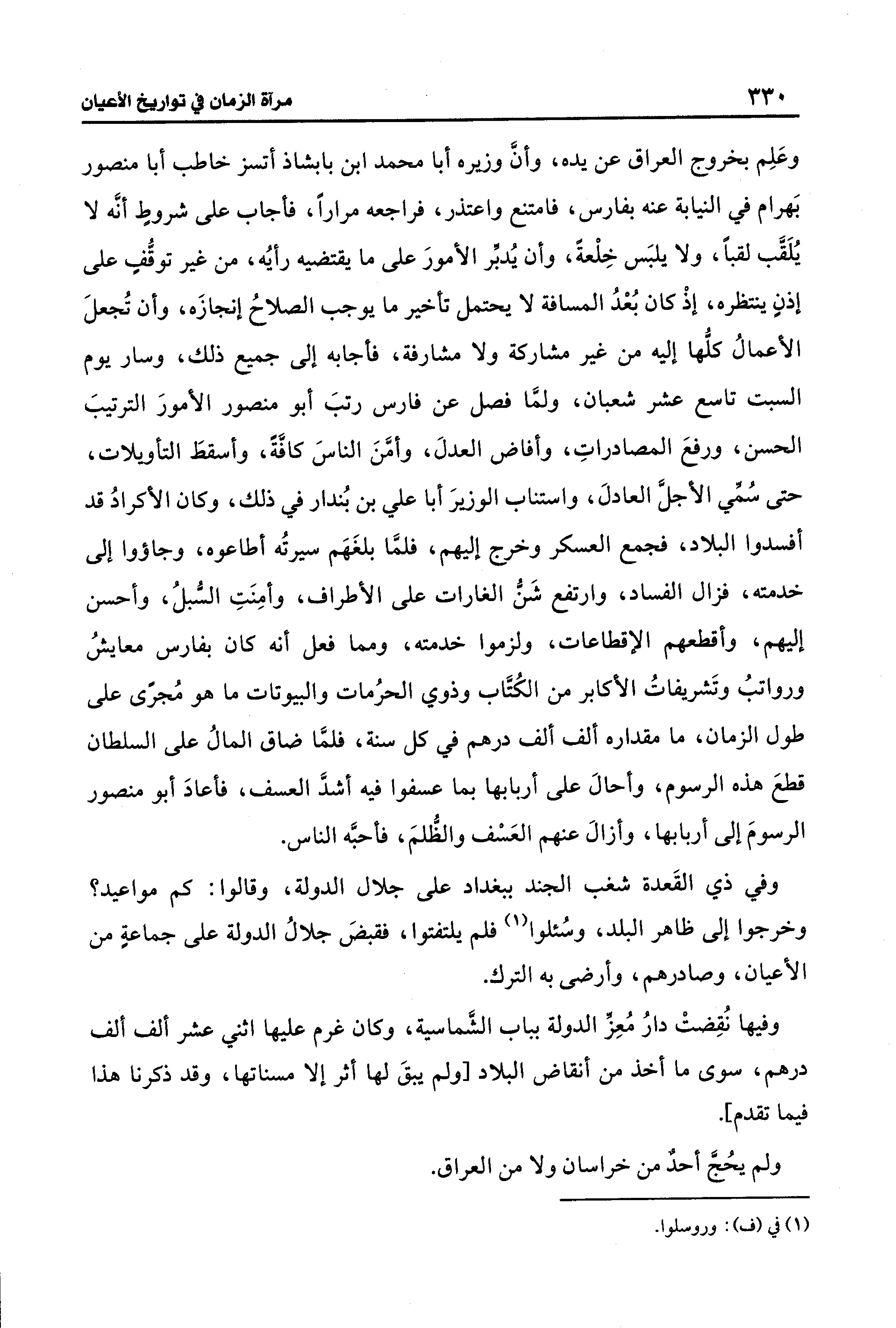 وعَلِم بخروج العراق عن يده، وأنَّ وزيره أبا محمد ابن بابشاذ أتسز خاطب أبا منصور بَهرام في النيابة عنه بفارس، فامتنع واعتذر، فراجعه مرارًا، فأجاب على شروط أنَّه لا يُلَقَّب لقبًا، ولا يلبَس خِلْعةً، وأن يُدبِّر الأمورَ على ما يقتضيه رأيُه، من غير توقُّفٍ على إذنٍ ينتظره، إذْ كان بُعْدُ المسافة لا يحتمل تأخير ما يوجب الصلاحُ إنجازَه، وأن تُجعلَ الأعمالُ كلُّها إليه من غير مشاركة ولا مشارفة، فأجابه إلى جميع ذلك، وسار يوم السبت تاسع عشر شعبان، ولمَّا فصل عن فارس رتبَ أبو منصور الأمورَ الترتيبَ الحسن، ورفعَ المصادراتِ، وأفاض العدلَ، وأمَّنَ الناسَ كافَّةً، وأسقطَ التأويلات، حتى سُمِّي الأجل العادلَ، واستناب الوزيرَ أبا علي بن بُندار في ذلك، وكان الأكرادُ قد أفسدوا البلاد، فجمع العسكر وخرج إليهم، فلمَّا بلغَهَم سيرتُه أطاعوه، وجاؤوا إلى خدمته، فزال الفساد، وارتفع شَنُّ الغارات على الأطراف، وأمِنَتِ السُّبلُ، وأحسن إليهم، وأقطعهم الإقطاعات، ولزموا خدمته، ومما فعل أنه كان بفارس معايشُ ورواتبُ وتَشريفاتُ الأكابر من الكُتَّاب وذوي الحرُمات والبيوتات ما هو مُجرًى على طول الزمان، ما مقداره ألف ألف درهم في كل سنة، فلمَّا ضاق المالُ على السلطان قطعَ هذه الرسوم، وأحال على أربابها بما عسفوا فيه أشدَّ العسف، فأعادَ أبو منصور الرسومَ إلى أربابها، وأزال عنهم العَسْف والظُّلمَ، فأحبَّه الناس.