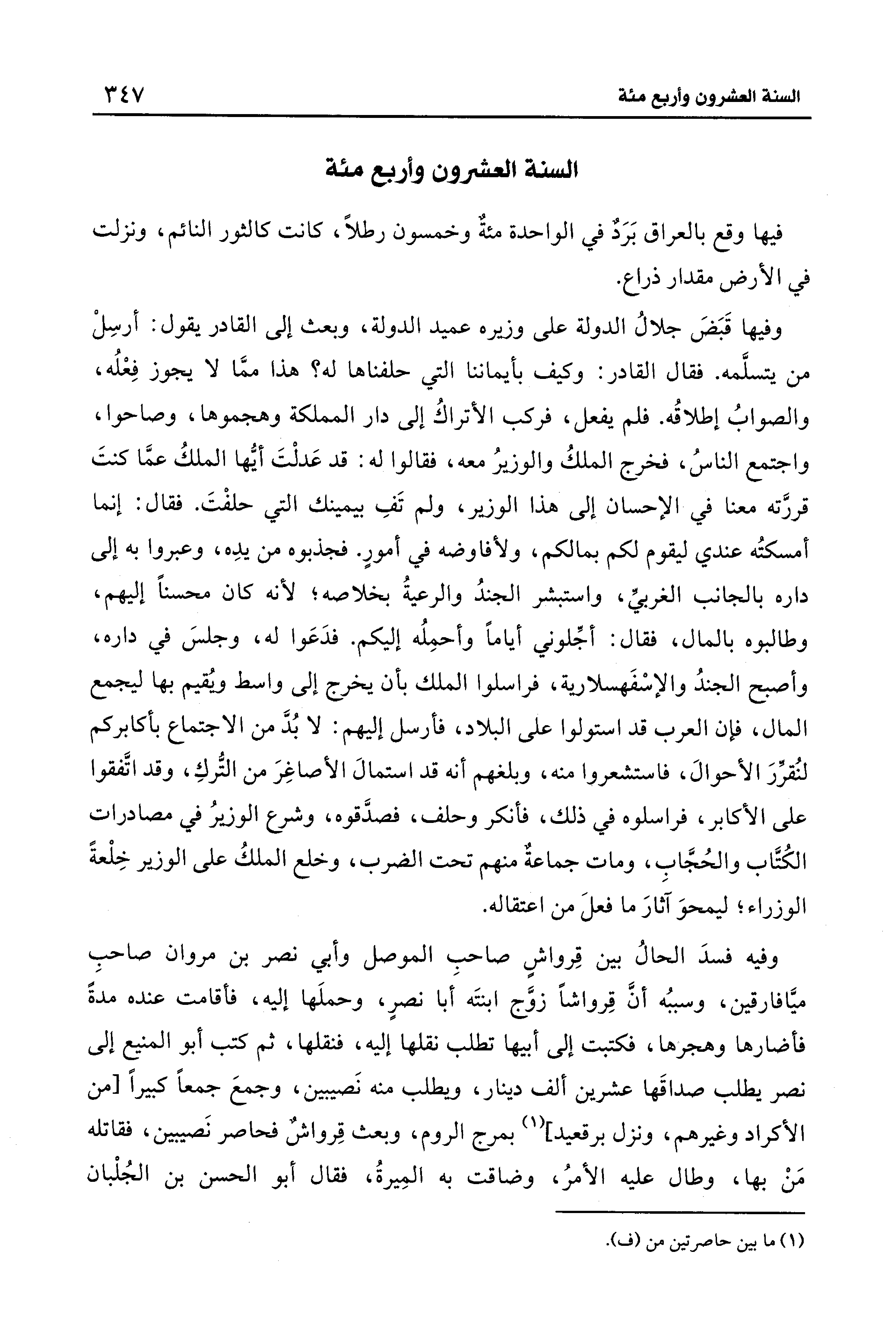 وفيها قَبَضَ جلالُ الدولة على وزيره عميد الدولة، وبعث إلى القادر يقول: أرسِلْ من يتسلَّمه. فقال القادر: وكيف بأيماننا التي حلفناها له؟ هذا ممَّا لا يجوز فِعْلُه، والصوابُ إطلاقُه. فلم يفعل، فركب الأتراكُ إلى دار المملكة وهجموها، وصاحوا، واجتمع الناسُ، فخرج الملكُ والوزيرُ معه، فقالوا له: قد عَدلْتَ أيُّها الملكُ عمَّا كنتَ قررَّته معنا في الإحسان إلى هذا الوزير، ولم تَفِ بيمينك التي حلفْتَ. فقال: إنما أمسكتُه عندي ليقوم لكم بمالكم، ولأفاوضه في أمورٍ. فجذبوه من يدِه، وعبروا به إلى داره بالجانب الغربيِّ، واستبشر الجندُ والرعيةُ بخلاصه؛ لأنه كان محسنًا إليهم، وطالبوه بالمال، فقال: أجِّلوني أيامًا وأحمِلُه إليكم. فدَعَوا له، وجلسَ في داره، وأصبح الجندُ والإسْفَهسلارية، فراسلوا الملك بأن يخرج إلى واسط ويُقيم بها ليجمع المال، فإن العرب قد استولوا على البلاد، فأرسل إليهم: لا بُدَّ من الاجتماع بأكابركم لنُقرِّرَ الأحوال، فاستشعروا منه، وبلغهم أنَّه قد استمال الأصاغِرَ من التُّركِ، وقد اتَّفقوا على الأكابر، فراسلوه في ذلك، فأنكر وحلف، فصدَّقوه، وشرع الوزيرُ في مصادرات الكُتَّاب والحُجَّابِ، ومات جماعةٌ منهم تحت الضرب، وخلع الملكُ على الوزير خِلْعةً الوزراء؛ ليمحوَ آثارَ ما فعلَ من اعتقاله.