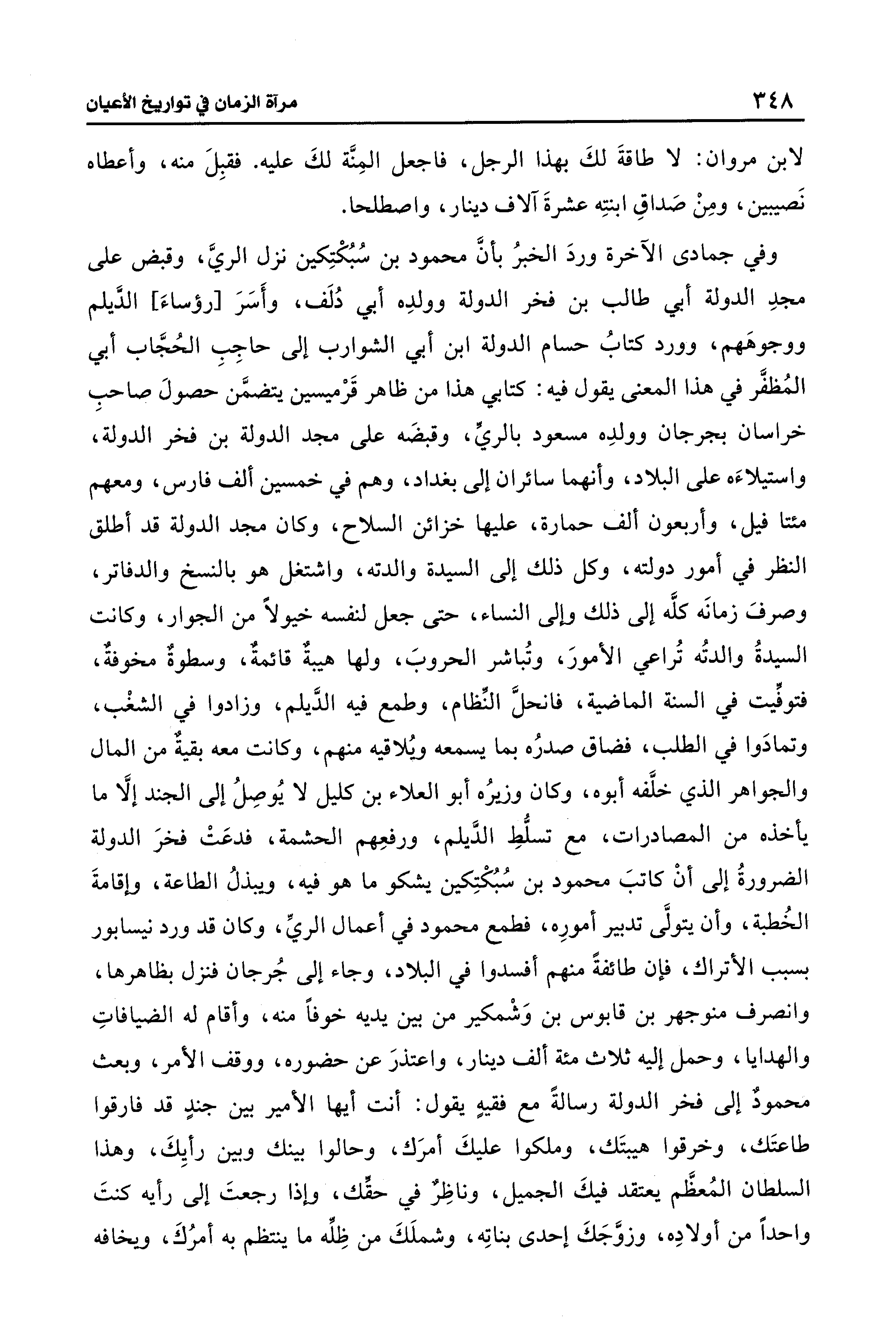 وفي جمادى الآخرة وردَ الخبرُ بأنَّ محمود بن سُبُكْتِكين نزل الريَّ، وقبض على مجدِ الدولة أبي طالب بن فخر الدولة وولدِه أبي دُلَف، وأَسَرَ [رؤساءَ] الدَّيلم ووجوهَهم، وورد كتابُ حسام الدولة ابن أبي الشوارب إلى حاجِبِ الحُجَّاب أبي المُظفَّر في هذا المعنى يقول فيه: كتابي هذا من ظاهر قَرْميسين يتضمَّن حصولَ صاحبِ خراسان بجرجان وولدِه مسعود بالريِّ، وقبضَه على مجد الدولة بن فخر الدولة، واستيلاءَه على البلاد، وأنهما سائران إلى بغداد، وهم في خمسين ألف فارس، ومعهم مئتا فيل، وأربعون ألف حمارة، عليها خزائن السلاح، وكان مجد الدولة قد أطلق النظر في أمور دولته، وكل ذلك إلى السيدة والدته، واشتغل هو بالنسخ والدفاتر، وصرفَ زمانَه كلَّه إلى ذلك وإلى النساء، حتَّى جعل لنفسه خيولًا من الجوار، وكانت السيدةُ والدتُه تُراعي الأمورَ، وتُباشر الحروبَ، ولها هيبةٌ قائمةٌ، وسطوةٌ مخوفةٌ، فتوفِّيت في السنة الماضية، فانحلَّ النِّظام، وطمع فيه الدَّيلم، وزادوا في الشغْب، وتمادَوا في الطلب، فضاق صدرُه بما يسمعه ويُلاقيه منهم، وكانت معه بقيةٌ من المال والجواهر الَّذي خلَّفه أبوه، وكان وزيرُه أبو العلاء بن كليل لا يُوصِلُ إلى الجند إلَّا ما يأخذه من المصادرات، مع تسلُّطِ الدَّيلم، ورفعِهم الحشمة، فدعَتْ فخرَ الدولة الضرورةُ إلى أنْ كاتبَ محمود بن سُبُكْتِكين يشكو ما هو فيه، ويبذلُ الطاعة، وإقامةَ الخُطبة، وأن يتولَّى تدبير أمورِه، فطمع محمود في أعمال الريِّ، وكان قد ورد نيسابور بسبب الأتراك، فإن طائفةً منهم أفسدوا في البلاد، وجاء إلى جُرجان فنزل بظاهرها، وانصرف منوجهر بن قابوس بن وَشْمكير من بين يديه خوفًا منه، وأقام له الضيافاتِ والهدايا، وحمل إليه ثلاث مئة ألف دينار، واعتذرَ عن حضوره، ووقف الأمر، وبعث محمودٌ إلى فخر الدولة رسالةً مع فقيهٍ يقول: أنت أيها الأمير بين جندٍ قد فارقوا طاعتَك، وخرقوا هيبتَك، وملكوا عليكَ أمرَك، وحالوا بينك وبين رأيِكَ، وهذا السلطان المُعظَّم يعتقد فيكَ الجميل، وناظِرٌ في حقِّك، وإذا رجعتَ إلى رأيه كنتَ واحدًا من أولادِه، وزوَّجَكَ إحدى بناتِه، وشملَكَ من ظِلِّه ما ينتظم به أمرُكَ، ويخافه