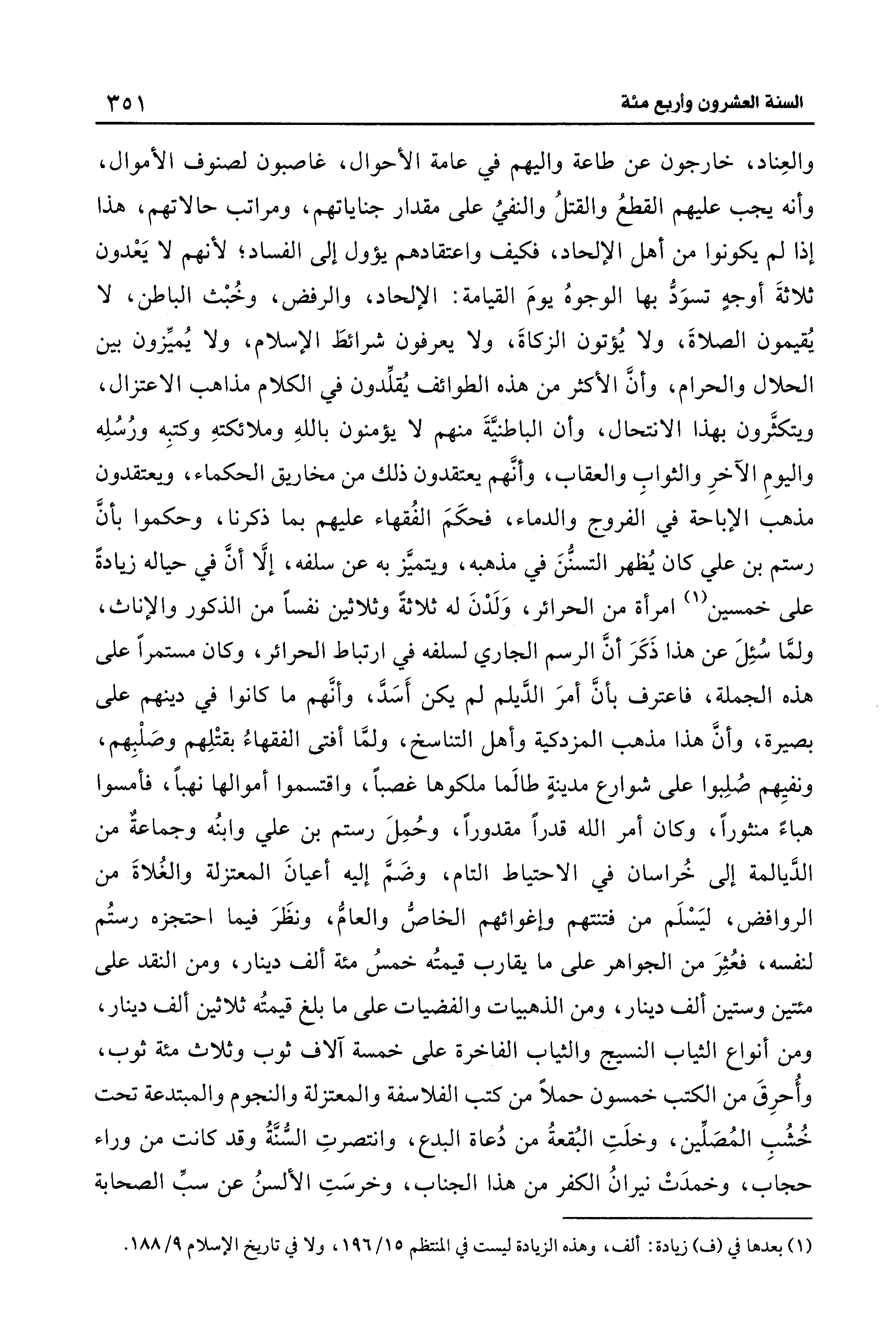 والعِناد، خارجون عن طاعة واليهم في عامة الأحوال، غاصبون لصنوف الأموال، وأنه يجب عليهم القطعُ والقتلُ والنفيُ على مقدار جناياتهم، ومراتب حالاتهم، هذا إذا لم يكونوا من أهل الإلحاد، فكيف واعتقادهم يؤول إلى الفساد؛ لأنهم لا يَعْدون ثلاثةَ أوجهٍ تسوَدُّ بها الوجوهُ يومَ القيامة: الإلحاد، والرفض، وخُبْث الباطن، لا يُقيمون الصلاةَ، ولا يُؤتون الزكاةَ، ولا يعرفون شرائطَ الإسلام، ولا يُميِّزون بين الحلال والحرام، وأنَّ الأكثر من هذه الطوائف يُقلِّدون في الكلام مذاهب الاعتزال، ويتكثَّرون بهذا الانتحال، وأن الباطنيَّةَ منهم لا يؤمنون باللهِ وملائكتهِ وكتبِه ورُسُلِه واليومِ الآخرِ والثوابِ والعقاب، وأنَّهم يعتقدون ذلك من مخاريق الحكماء، ويعتقدون مذهب الإباحة في الفروج والدماء، فحكَمَ الفُقهاء عليهم بما ذكرنا، وحكموا بأنَّ رستم بن علي كان يُظهر التسنُّنَ في مذهبه، ويتميَّز به عن سلفه، إلا أنَّ في حياله زيادةً على خمسين (¬1) امرأة من الحرائر، وَلَدْنَ له ثلاثة وثلاثين نفسًا من الذكور والإناث، ولمَّا سُئِلَ عن هذا ذَكَرَ أنَّ الرسم الجاري لسلفه في ارتباط الحرائر، وكان مستمرًا على هذه الجملة، فاعترف بأنَّ أمرَ الدَّيلم لم يكن أَسَدَّ، وأنَّهم ما كانوا في دينهم على بصيرة، وأنَّ هذا مذهب المزدكية وأهل التناسخ، ولمَّا أفتى الفقهاءُ بقتْلِهم وصَلْبِهم، ونفيِهم صُلِبوا على شوارع مدينةٍ طالما ملكوها غصبًا، واقتسموا أموالها نهبًا، فأمسوا هباءً منثورًا، وكان أمر الله قدرًا مقدورًا، وحُمِلَ رستم بن علي وابنُه وجماعةٌ من الدَّيالمة إلى خُراسان في الاحتياط التام، وضمَّ إليه أعيانَ المعتزلة والغُلاةَ من الروافض، ليَسْلَم من فتنتهم وإغوائهم الخاصُّ والعامُّ، ونظَرَ فيما احتجزه رستُم لنفسه، فعُثِرَ من الجواهر على ما يقارب قيمتُه خمسُ مئة ألف دينار، ومن النقد على مئتين وستين ألف دينار، ومن الذهبيات والفضيات على ما بلغ قيمتُه ثلاثين ألف دينار، ومن أنواع الثياب النسيج والثياب الفاخرة على خمسة آلاف ثوب وثلاث مئة ثوب، وأُحرِقَ من الكتب خمسون حملًا من كتب الفلاسفة والمعتزلة والنجوم والمبتدعة تحت خُشُبِ المُصَلِّين، وخلَتِ البُقعةُ من دُعاة البدع، وانتصرتِ السُّنَّةُ وقد كانت من وراء حجاب، وخمدَتْ نيرانُ الكفر من هذا الجناب، وخرسَتِ الألسنُ عن سبِّ الصحابة