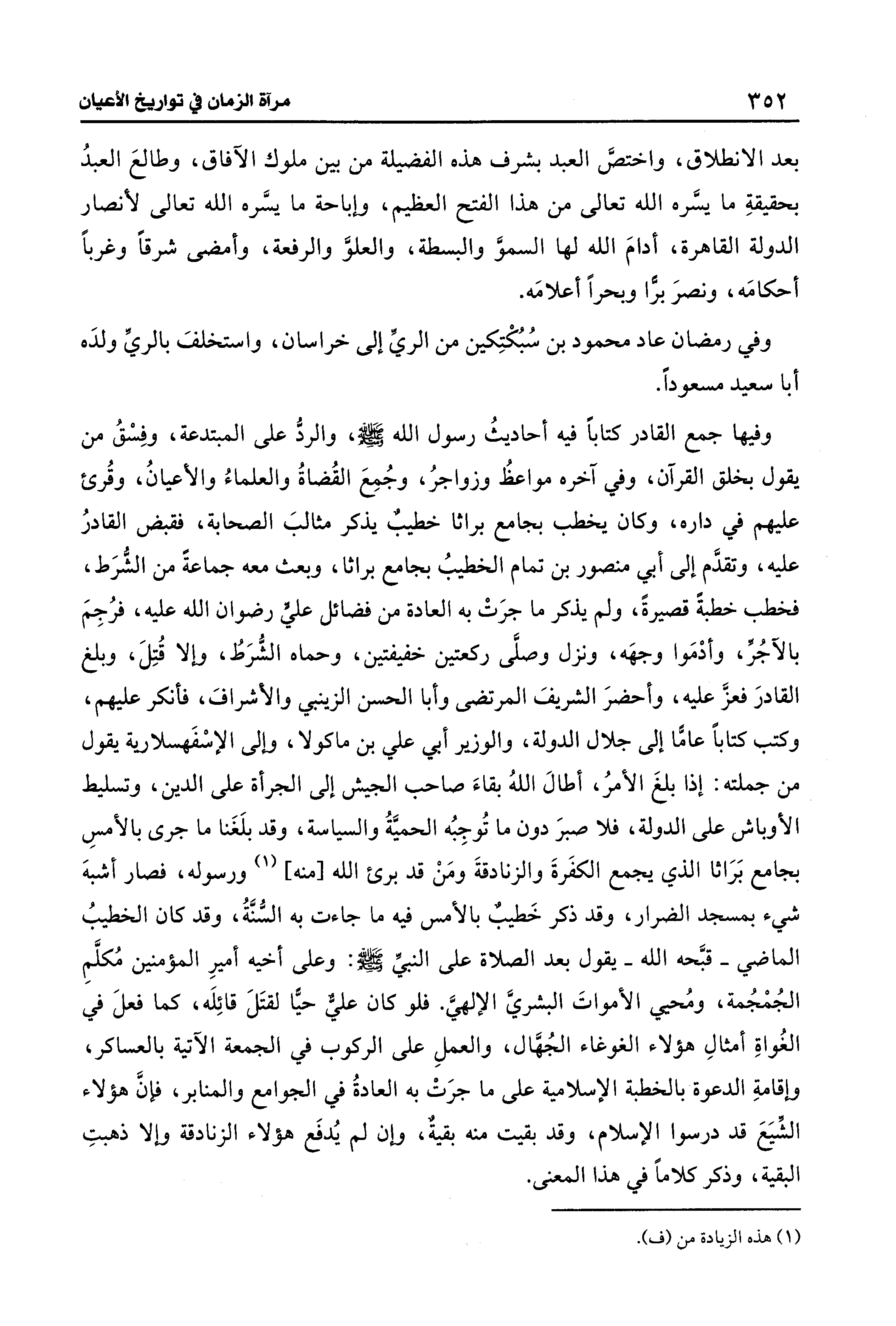 وفي رمضان عاد محمود بن سُبُكْتِكين من الريِّ إلى خراسان، واستخلفَ بالريِّ ولدَه أبا سعيد مسعودًا. وفيها جمع القادر كتابًا فيه أحاديثُ رسول الله - صلى الله عليه وسلم -، والردُّ على المبتدعة، وفِسْقُ من يقول بخلق القرآن، وفي آخره مواعظُ وزواجرُ، وجُمِعَ القُضاةُ والعلماءُ والأعيانُ، وقُرئ عليهم في داره، وكان يخطب بجامع براثا خطيبٌ يذكر مثالبَ الصحابة، فقبض القادرُ عليه، وتقدَّم إلى أبي منصور بن تمام الخطيبُ بجامع براثا، وبعث معه جماعةً من الشُّرَط، فخطب خطبة قصيرةً، ولم يذكر ما جرَتْ به العادة من فضائل عليٍّ رضوان الله عليه، فرُجِمَ بالآجُرِّ، وأدْمَوا وجهَه، ونزل وصلَّى ركعتين خفيفتين، وحماه الشُّرَطُ، وإلا قُتِلَ، وبلغ القادرَ فعزَّ عليه، وأحضرَ الشريفَ المرتضى وأبا الحسن الزينبي والأشرافَ، فأنكر عليهم، وكتب كتابًا عامًّا إلى جلال الدولة، والوزير أبي علي بن ماكولا، وإلى الإسْفَهسلارية يقول من جملته: إذا بلغَ الأمرُ، أطال اللهُ بقاءَ صاحب الجيش إلى الجرأة على الدين، وتسليط الأوباش على الدولة، فلا صبرَ دون ما تُوجِبُه الحميَّةُ والسياسة، وقد بلَغَنا ما جرى بالأمسِ بجامع بَرَاثا الَّذي يجمع الكفَرةَ والزنادقةَ ومَنْ قد برئ الله [منه] (¬1) ورسوله، فصار أشبهَ شيء بمسجد الضرار، وقد ذكر خَطيبٌ بالأمس فيه ما جاءت به السُّنَّةُ، وقد كان الخطيبُ الماضي -قبَّحه الله- يقول بعد الصلاة على النبي - صلى الله عليه وسلم -: وعلى أخيه أميرِ المؤمنين مُكلَّمِ الجُمْجُمة، ومُحيي الأمواتَ البشريَّ الإلهيَّ. فلو كان عليٌّ حيًّا لقتَلَ قائِلَه، كما فعلَ في الغُواةِ أمثالِ هؤلاء الغوغاء الجُهَّال، والعملِ على الركوب في الجمعة الآتية بالعساكر، وإقامةِ الدعوة بالخطبة الإسلامية على ما جرَتْ به العادةُ في الجوامع والمنابر، فإنَّ هؤلاء الشِّيَعَ قد درسوا الإسلام، وقد بقيت منه بقيةٌ، وإن لم يُدفَع هؤلاء الزنادقة وإلا ذهبتِ البقية، وذكر كلامًا في هذا المعنى.