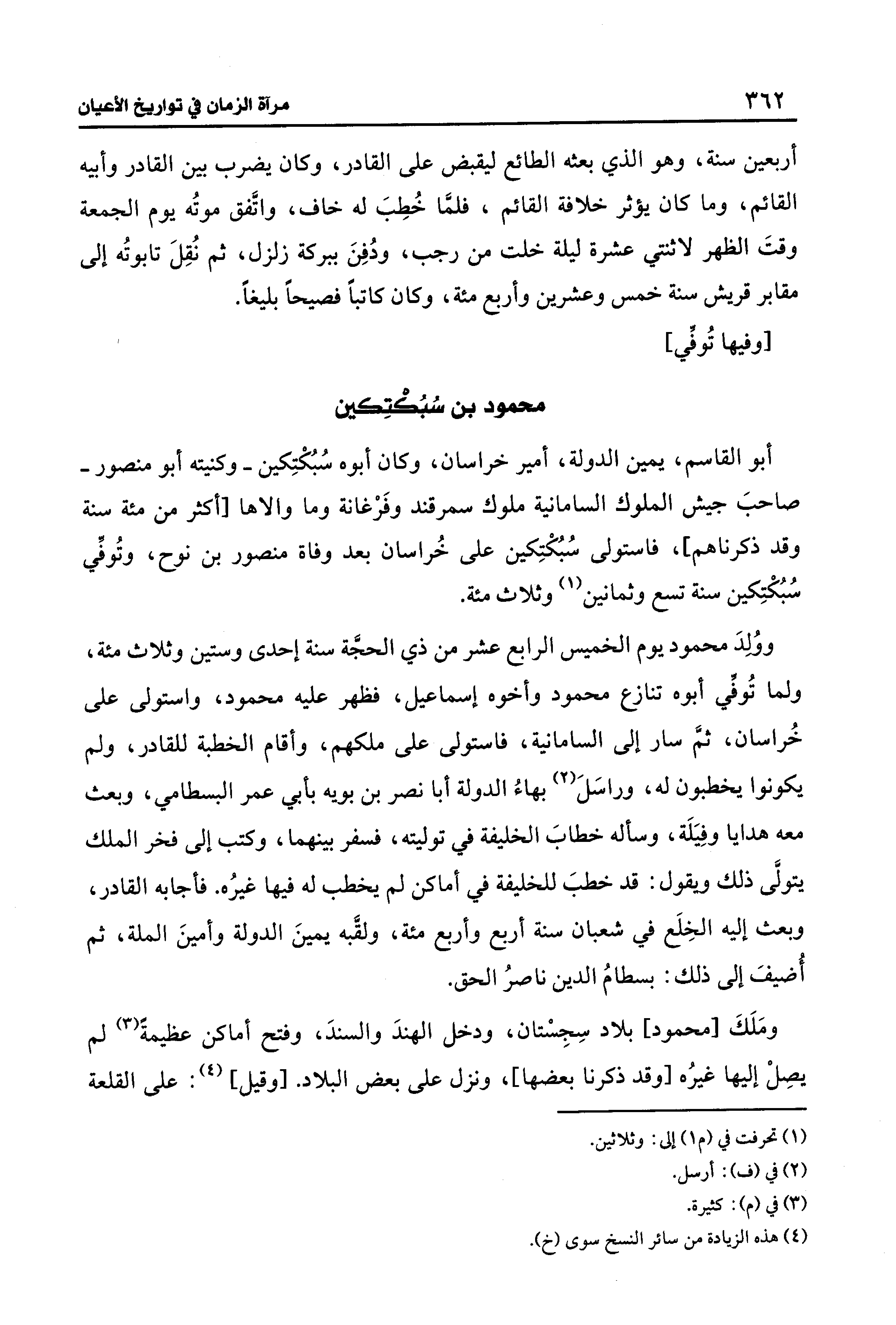 أبو القاسم، يمين الدولة، أمير خراسان، وكان أبوه سُبُكْتِكين -وكنيته أبو منصور- صاحبَ جيش الملوك السامانية ملوك سمرقند وفَرْغانة وما والاها [أكثر من مئة سنة وقد ذكرناهم]، فاستولى سُبُكْتِكين على خُراسان بعد وفاة منصور بن نوح، وتُوفِّي سُبُكْتِكين سنة تسع وثمانين (¬1) وثلاث مئة.