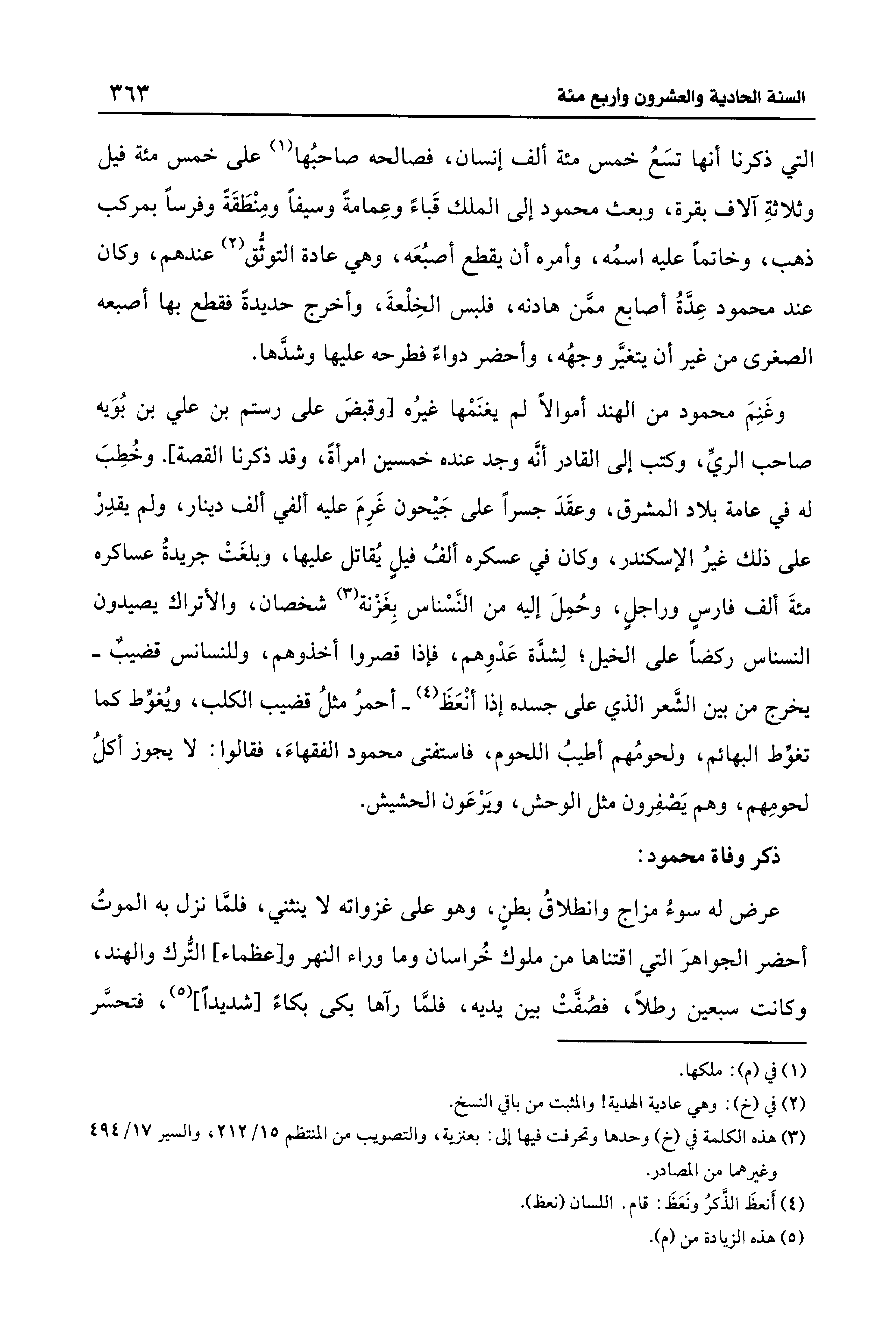 وغَنِمَ محمود من الهند أموالًا لم يغنَمْها غيرُه [وقبضَ على رستم بن علي بن بُوَيه صاحب الريِّ، وكتب إلى القادر أنَّه وجد عنده خمسين امرأةً، وقد ذكرنا القصة]. وخُطِبَ له في عامة بلاد المشرق، وعقَدَ جسرًا على جَيحون غَرِمَ عليه ألفي ألف دينار، ولم يقدِرْ على ذلك غيرُ الإسكندر، وكان في عسكره ألفُ فيلٍ يُقاتل عليها، وبلغَتْ جريدةُ عساكره مئةَ ألف فارسٍ وراجلٍ، وحُمِلَ إليه من النَّسْناس بِغَزْنة (¬3) شخصان، والأتراك يصيدون النسناس ركضًا على الخيل؛ لِشدَّة عَدْوهم، فإذا قصروا أخذوهم، وللنسانس قضيبٌ -يخرج من بين الشَّعر الَّذي على جسده إذا أنْعَظَ (¬4) - أحمرُ مثلُ قضيب الكلب، ويغوِّط كما تغوِّط البهائم، ولحومُهم أطيبُ اللحوم، فاستفتى محمود الفقهاءَ، فقالوا: لا يجوز أكلُ لحومِهم، وهم يَصْفِرون مثل الوحش، ويَرْعَون الحشيش.