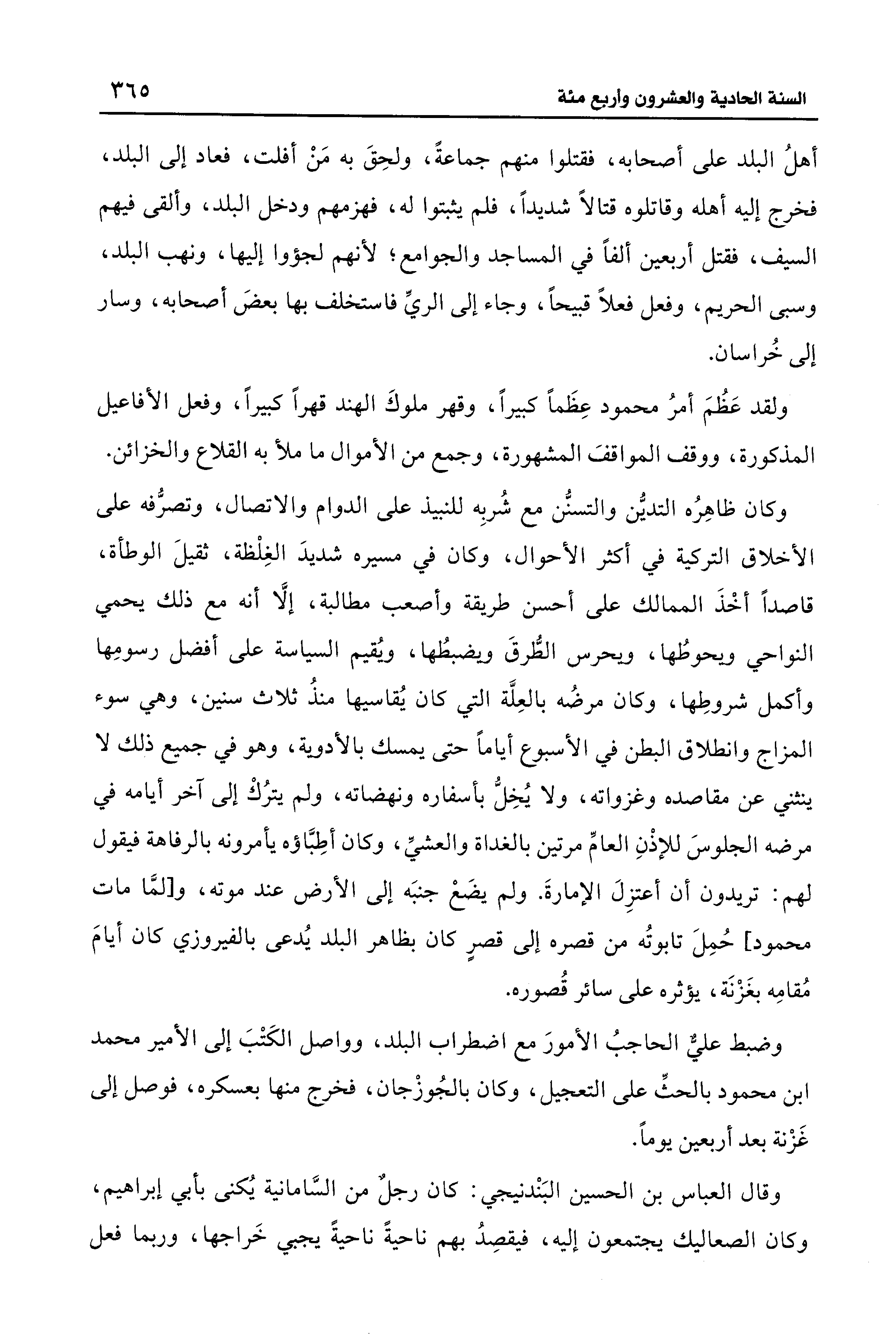 ولقد عَظُمَ أمرُ محمود عِظَمًا كبيرًا، وقهر ملوكَ الهند قهرًا كبيرًا، وفعل الأفاعيل المذكورة، ووقف المواقفَ المشهورة، وجمع من الأموال ما ملأ به القلاع والخزائن.