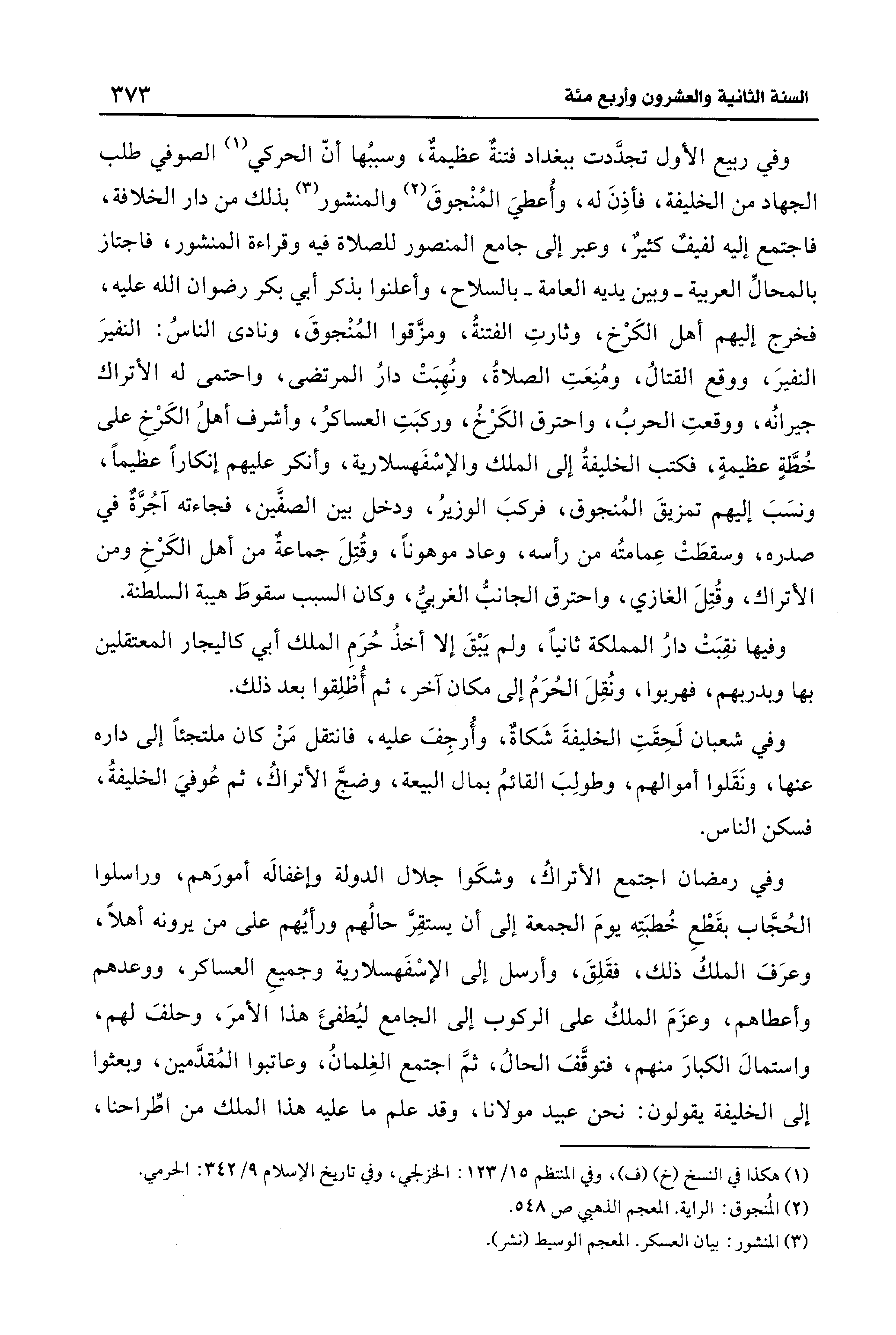 وفي ربيع الأول تجدَّدت ببغداد فتنةٌ عظيمةٌ، وسببُها أنّ الحركي (¬1) الصوفي طلب الجهاد من الخليفة، فأذِنَ له، وأُعطيَ المُنْجوقَ (¬2) والمنشور (¬3) بذلك من دار الخلافة، فاجتمع إليه لفيفٌ كثيرٌ، وعبر إلى جامع المنصور للصلاة فيه وقراءة المنشور، فاجتاز بالمحالِّ العربية -وبين يديه العامة- بالسلاح، وأعلنوا بذكر أبي بكر رضوان الله عليه، فخرج إليهم أهل الكَرْخ، وثارتِ الفتنةُ، ومزَّقوا المُنْجوقَ، ونادى الناسُ: النفيرَ النفيرَ، ووقع القتالُ، ومُنِعَتِ الصلاةُ، ونُهِبَتْ دارُ المرتضى، واحتمى له الأتراك جيرانُه، ووقعتِ الحربُ، واحترق الكَرْخُ، وركبَتِ العساكرُ، وأشرف أهلُ الكَرْخِ على خُطَّةٍ عظيمةٍ، فكتب الخليفةُ إلى الملك والإسْفَهسلارية، وأنكر عليهم إنكارًا عظيمًا، ونسَبَ إليهم تمزيقَ المُنجوق، فركبَ الوزيرُ، ودخل بين الصفَّين، فجاءته آجُرَّةٌ في صدره، وسقطَتْ عِمامتُه من رأسه، وعاد موهونًا، وقُتِلَ جماعةٌ من أهل الكَرْخِ ومن الأتراك، وقُتِلَ الغازي، واحترق الجانبُّ الغربيُّ، وكان السبب سقوطَ هيبة السلطنة.
