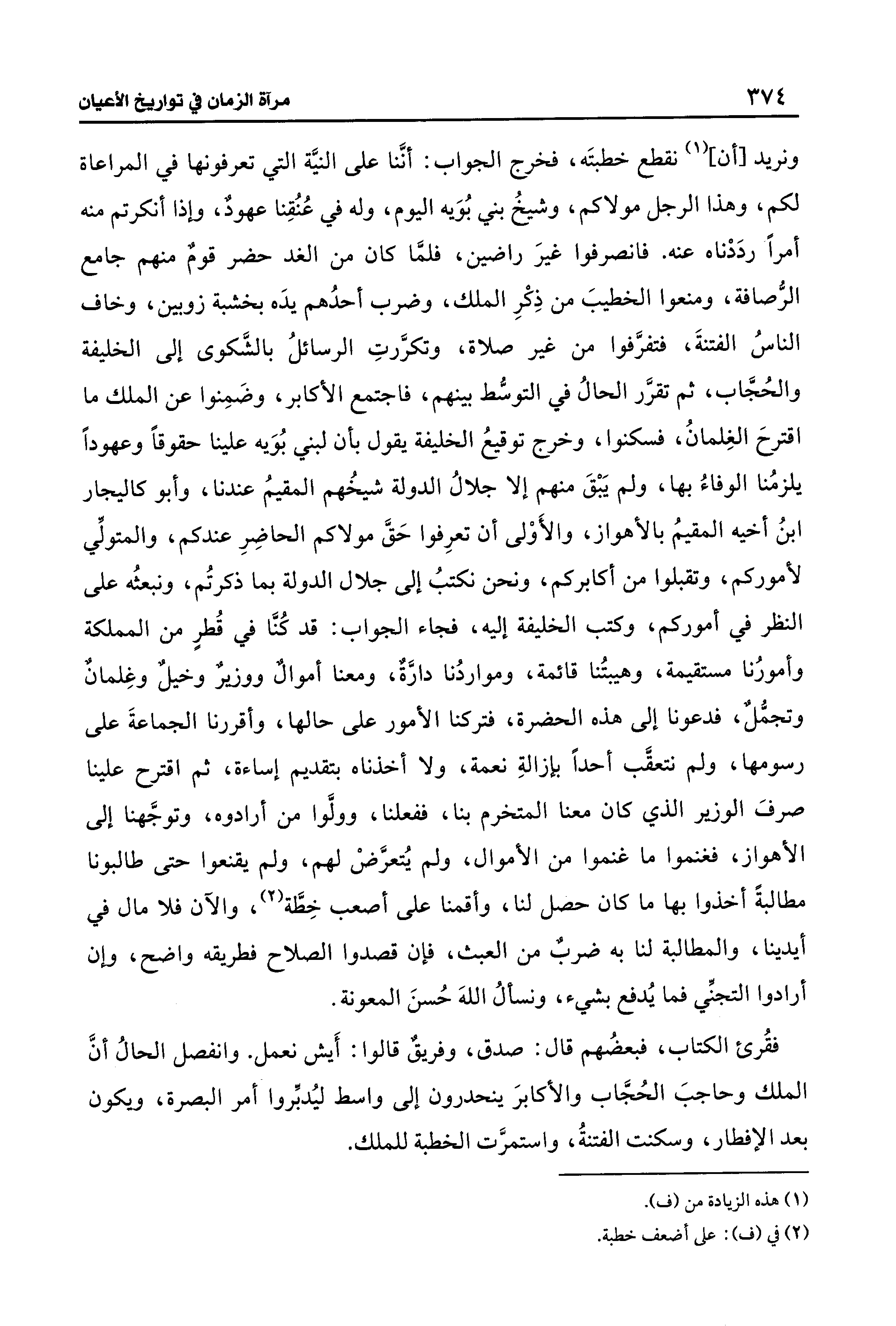ونريد [أن] (¬1) نقطع خطبتَه، فخرج الجواب: أنَّنا على النيَّة التي تعرفونها في المراعاة لكم، وهذا الرجل مولاكم، وشيخُ بني بُوَيه اليوم، وله في عُنُقِنا عهودٌ، وإذا أنكرتم منه أمرًا ردَدْناه عنه. فانصرفوا غيرَ راضين، فلمَّا كان من الغد حضر قومٌ منهم جامع الرُّصافة، ومنعوا الخطيبَ من ذِكْرِ الملك، وضرب أحدُهم يدَه بخشبة زوبين، وخاف الناسُ الفتنةَ، فتفرَّفوا من غير صلاة، وتكرَّرتِ الرسائلُ بالشَّكوى إلى الخليفة والحُجَّاب، ثم تقرَّر الحالُ في التوسُّط بينهم، فاجتمع الأكابر، وضَمِنوا عن الملك ما اقترحَ الغِلمانُ، فسكنوا، وخرج توقيعُ الخليفة يقول بأن لبني بُوَيه علينا حقوقًا وعهودًا يلزمُنا الوفاءُ بها، ولم يَبْقَ منهم إلا جلالُ الدولة شيخُهم المقيمُ عندنا، وأبو كاليجار ابنُ أخيه المقيمُ بالأهواز، والأَوْلى أن تعرِفوا حَقَّ مولاكم الحاضِرِ عندكم، والمتولِّي لأموركم، وتقبلوا من أكابركم، ونحن نكتبُ إلى جلال الدولة بما ذكرتُم، ونبعثُه على النظر في أموركم، وكتب الخليفة إليه، فجاء الجواب: قد كُنَّا في قُطرٍ من المملكة وأمورُنا مستقيمة، وهيبتُنا قائمة، ومواردُنا دارَّةٌ، ومعنا أموالٌ ووزيرٌ وخيلٌ وغِلمانٌ وتجمُّلٌ، فدعونا إلى هذه الحضرة، فتركنا الأمور على حالها، وأقررنا الجماعةَ على رسومها، ولم نتعقب أحدًا بإزالةِ نعمة، ولا أخذناه بتقديم إساءة، ثم اقترح علينا صرفَ الوزير الَّذي كان معنا المتخرم بنا، ففعلنا، وولَّوا من أرادوه، وتوجَّهنا إلى الأهواز، فغنموا ما غنموا من الأموال، ولم يُتعرَّضْ لهم، ولم يقنعوا حتَّى طالبونا مطالبةً أخذوا بها ما كان حصل لنا، وأقمنا على أصعب خِطَّة (¬2)، والآن فلا مال في أيدينا، والمطالبة لنا به ضربٌ من العبث، فإن قصدوا الصلاح فطريقه واضح، وإن أرادوا التجنِّي فما يُدفع بشيء، ونسألُ اللهَ حُسنَ المعونة.