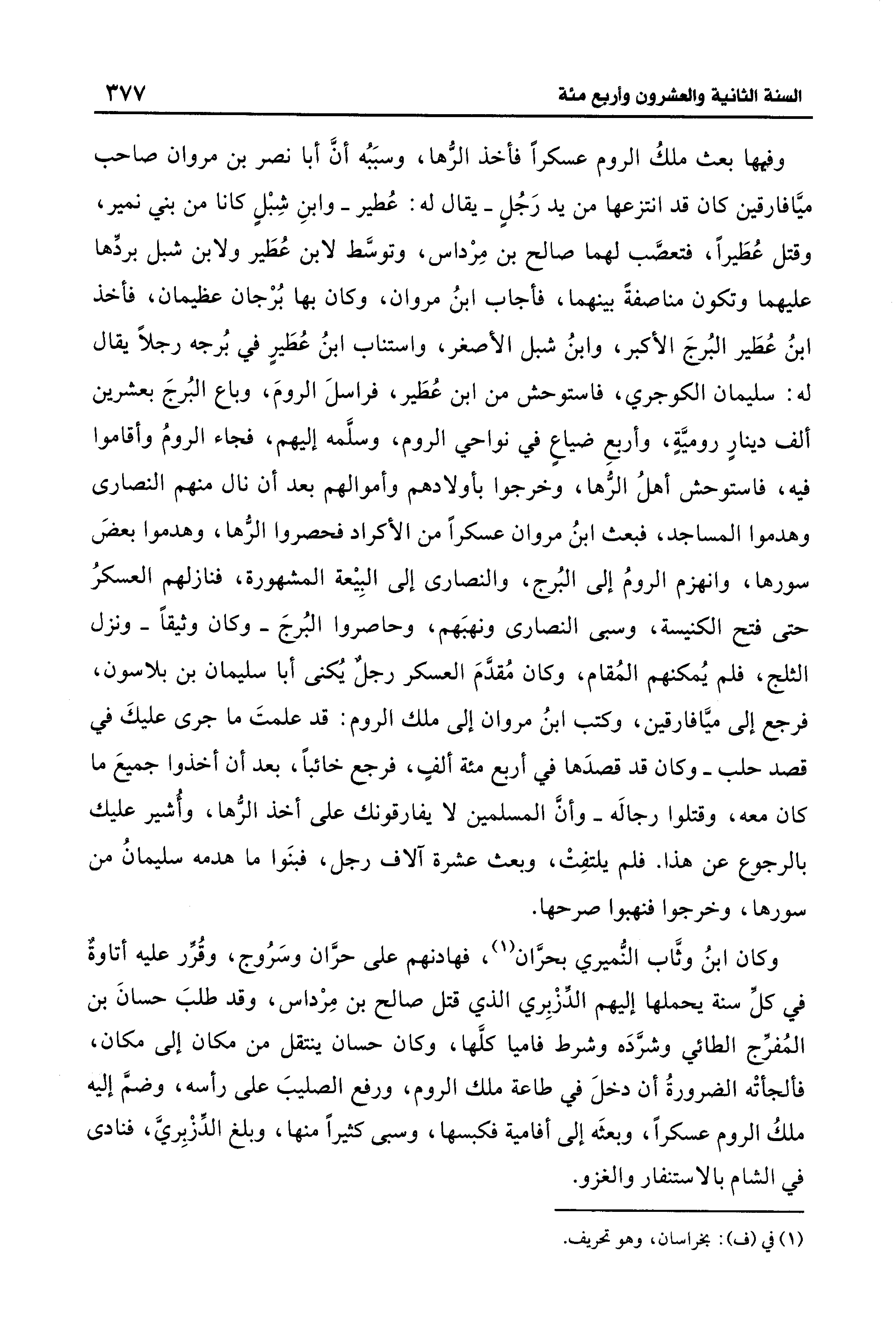 وفيها بعث ملكُ الروم عسكرًا فأخذ الرُّها، وسبَبُه أنَّ أبا نصر بن مروان صاحب ميَّافارقين كان قد انتزعها من يد رَجُلٍ -يقال له: عُطير- وابنِ شِبْلٍ كانا من بني نمير، وقتل عُطَيرًا، فتعصَّب لهما صالح بن مِرْداس، وتوسَّط لابن عُطَير ولابن شبل بردِّها عليهما وتكون مناصفةً بينهما، فأجاب ابنُ مروان، وكان بها بُرْجان عظيمان، فأخذ ابنُ عُطَير البُرجَ الأكبر، وابنُ شبل الأصغر، واستناب ابنُ عُطَيرٍ في بُرجه رجلًا يقال له: سليمان الكوجري، فاستوحش من ابن عُطَير، فراسلَ الرومَ، وباع البُرجَ بعشرين ألف دينارٍ روميَّةٍ، وأربعِ ضياعٍ في نواحي الروم، وسلَّمه إليهم، فجاء الرومُ وأقاموا فيه، فاستوحش أهلُ الرُّها، وخرجوا بأولادهم وأموالهم بعد أن نال منهم النصارى وهدموا المساجد، فبعث ابنُ مروان عسكرًا من الأكراد فحصروا الرُّها، وهدموا بعضَ سورها، وانهزم الرومُ إلى البُرج، والنصارى إلى البِيعة المشهورة، فنازلهم العسكرُ حتَّى فتح الكنيسة، وسبى النصارى ونهبَهم، وحاصروا البُرجَ -وكان وثيقًا- ونزل الثلج، فلم يُمكنهم المُقام، وكان مُقدَّمَ العسكر رجلٌ يُكنى أبا سليمان بن بلاسون، فرجع إلى ميَّافارقين، وكتب ابنُ مروان إلى ملك الروم: قد علمتَ ما جرى عليكَ في قصد حلب -وكان قد قصدَها في أربع مئة ألفٍ، فرجع خائبًا، بعد أن أخذوا جميعَ ما كان معه، وقتلوا رجاله- وأنَّ المسلمين لا يفارقونك على أخذ الرُّها، وأُشير عليك بالرجوع عن هذا. فلم يلتفِتْ، وبعث عشرة آلاف رجل، فبنَوا ما هدمه سليمانُ من سورها، وخرجوا فنهبوا صرحها.