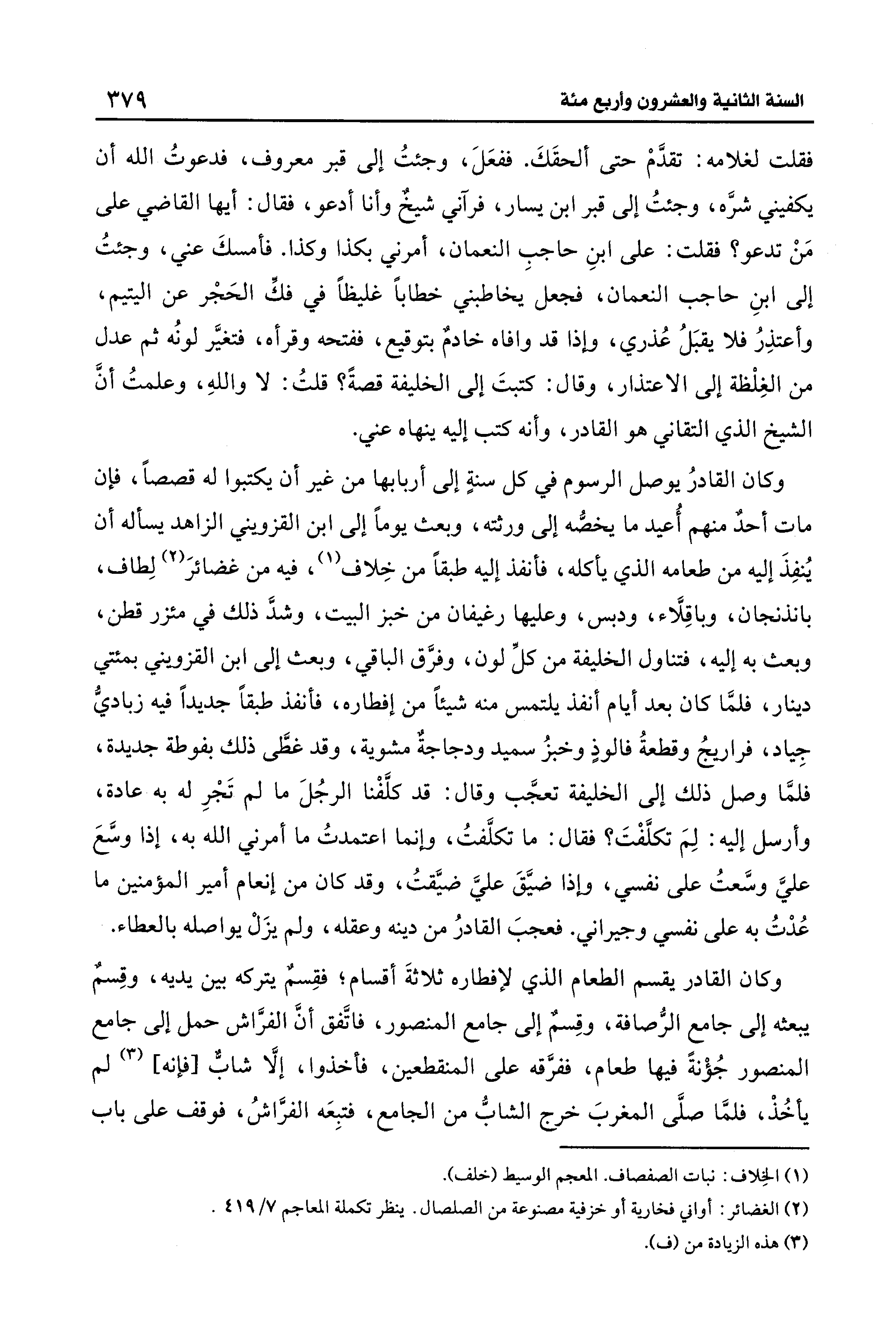 وكان القادرُ يوصل الرسوم في كل سنةٍ إلى أربابها من غير أن يكتبوا له قصصًا، فإن مات أحدٌ منهم أُعيد ما يخصُّه إلى ورثته، وبعث يومًا إلى ابن القزويني الزاهد يسأله أن يُنفِذَ إليه من طعامه الَّذي يأكله، فأنفذ إليه طبقًا من خِلاف (¬1)، فيه من غضائرَ (¬2) لِطاف، بانذنجان، وباقِلَّاء، ودبس، وعليها رغيفان من خبز البيت، وشدَّ ذلك في مئزر قطن، وبعث به إليه، فتناول الخليفة من كلِّ لون، وفرَّق الباقي، وبعث إلى ابن القزويني بمئتي دينار، فلمَّا كان بعد أيام أنفذ يلتمس منه شيئًا من إفطاره، فأنفذ طبقًا جديدًا فيه زباديُّ جِياد، فراريجُ وقطعةُ فالوذٍ وخبزُ سعيد ودجاجةٌ مشوية، وقد غطَّى ذلك بفوطة جديدة، فلمَّا وصل ذلك إلى الخليفة تعجَّب وقال: قد كلَّفْنا الرجُلَ ما لم تَجْرِ له به عادة، وأرسل إليه: لِمَ تكلَّفْتَ؟ فقال: ما تكلَّفتُ، وإنما اعتمدتُ ما أمرني الله به، إذا وسَّعَ عليَّ وسَّعتُ على نفسي، وإذا ضيَّقَ عليَّ ضيَّقتُ، وقد كان من إنعام أمير المؤمنين ما عُدْتُ به على نفسي وجيراني. فعجبَ القادرُ من دينه وعقله، ولم يزَلْ يواصله بالعطاء.