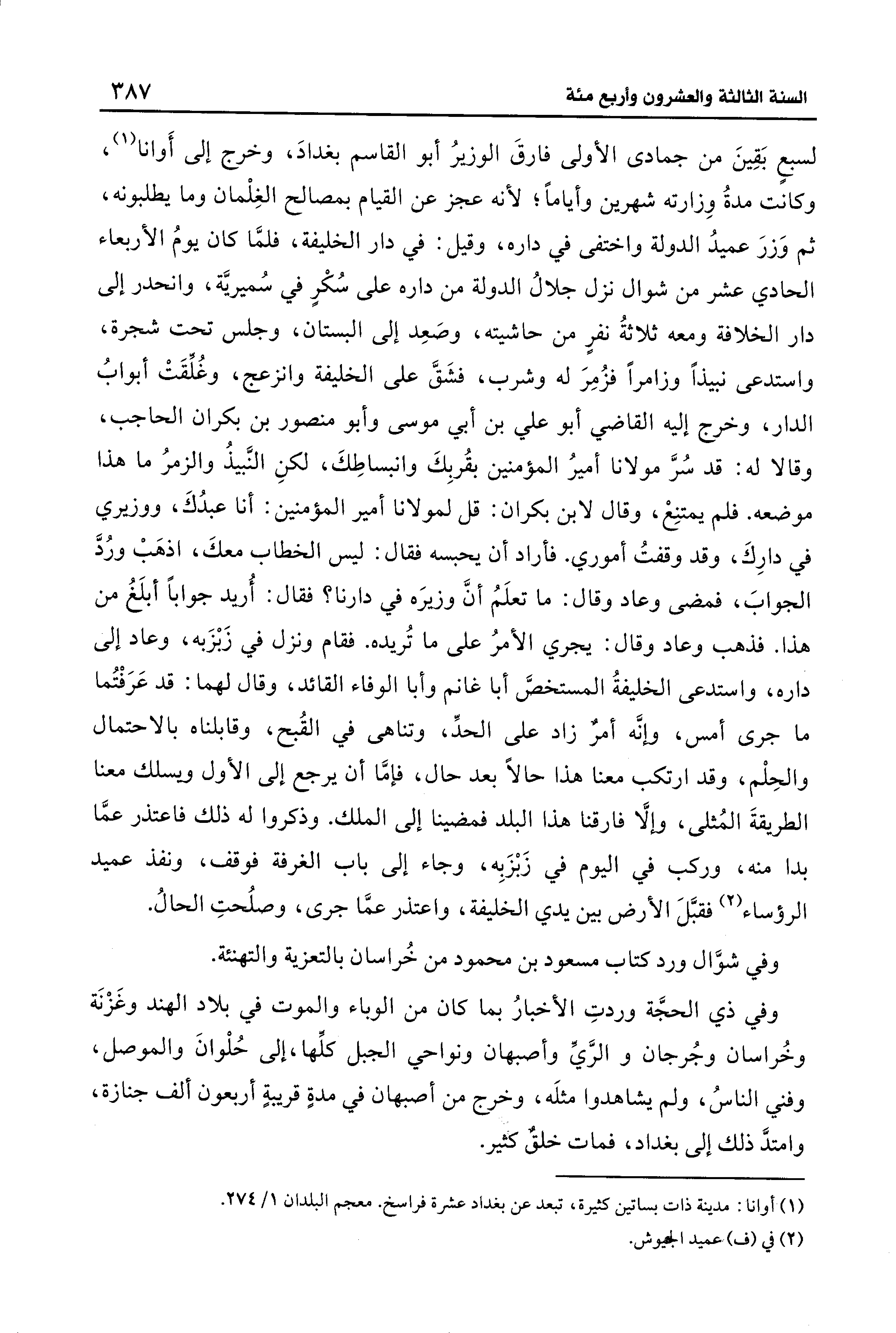 لسبعٍ بَقِينَ من جمادى الأولى فارقَ الوزيرُ أبو القاسم بغدادَ، وخرج إلى أَوانا (¬1)، وكانت مدةُ وزارته شهرين وأيامًا؛ لأنه عجز عن القيام بمصالح الغِلْمان وما يطلبونه، ثم وَزرَ عميدُ الدولة واختفى في داره، وقيل: في دار الخليفة، فلمَّا كان يومُ الأربعاء الحادي عشر من شوال نزل جلالُ الدولة من داره على سُكْرٍ في سُميريَّة، وانحدر إلى دار الخلافة ومعه ثلاثةُ نفرٍ من حاشيته، وصَعِد إلى البستان، وجلس تحت شجرة، واستدعى نبيذًا وزامرًا فزُمِرَ له وشرب، فشَقَّ على الخليفة وانزعج، وغُلِّقَتْ أبوابُ الدار، وخرج إليه القاضي أبو علي بن أبي موسى وأبو منصور بن بكران الحاجب، وقالا له: قد سُرَّ مولانا أميرُ المؤمنين بقُربِكَ وانبساطِكَ، لكنِ النَّبيذُ والزمرُ ما هذا موضعه. فلم يمتنِعْ، وقال لابن بكران: قل لمولانا أمير المؤمنين: أنا عبدُكَ، ووزيري في دارِكَ، وقد وقفتُ أموري. فأراد أن يحبسه فقال: ليس الخطاب معكَ، اذهَبْ ورُدَّ الجوابَ، فمضى وعاد وقال: ما تعلَمُ أنَّ وزيرَه في دارنا؟ فقال: أُريد جوابًا أبلَغُ من هذا. فذهب وعاد وقال: يجري الأمرُ على ما تُريده. فقام ونزل في زَبْزَبه، وعاد إلى داره، واستدعى الخليفةُ المستخصَّ أبا غانم وأبا الوفاء القائد، وقال لهما: قد عَرَفْتُما ما جرى أمس، وإنَّه أمرٌ زاد على الحدِّ، وتناهى في القُبح، وقابلناه بالاحتمال والحِلْم، وقد ارتكب معنا هذا حالًا بَعد حال، فإمَّا أن يرجع إلى الأول ويسلك معنا الطريقةَ المُثلى، وإلَّا فارقنا هذا البلد فمضينا إلى الملك. وذكروا له ذلك فاعتذر عمَّا بدا منه، وركب في اليوم في زَبْزَبِه، وجاء إلى باب الغرفة فوقف، ونفذ عميد الرؤساء (¬2) فقبَّلَ الأرض بين يدي الخليفة، واعتذر عمَّا جرى، وصلُحتِ الحالُ.