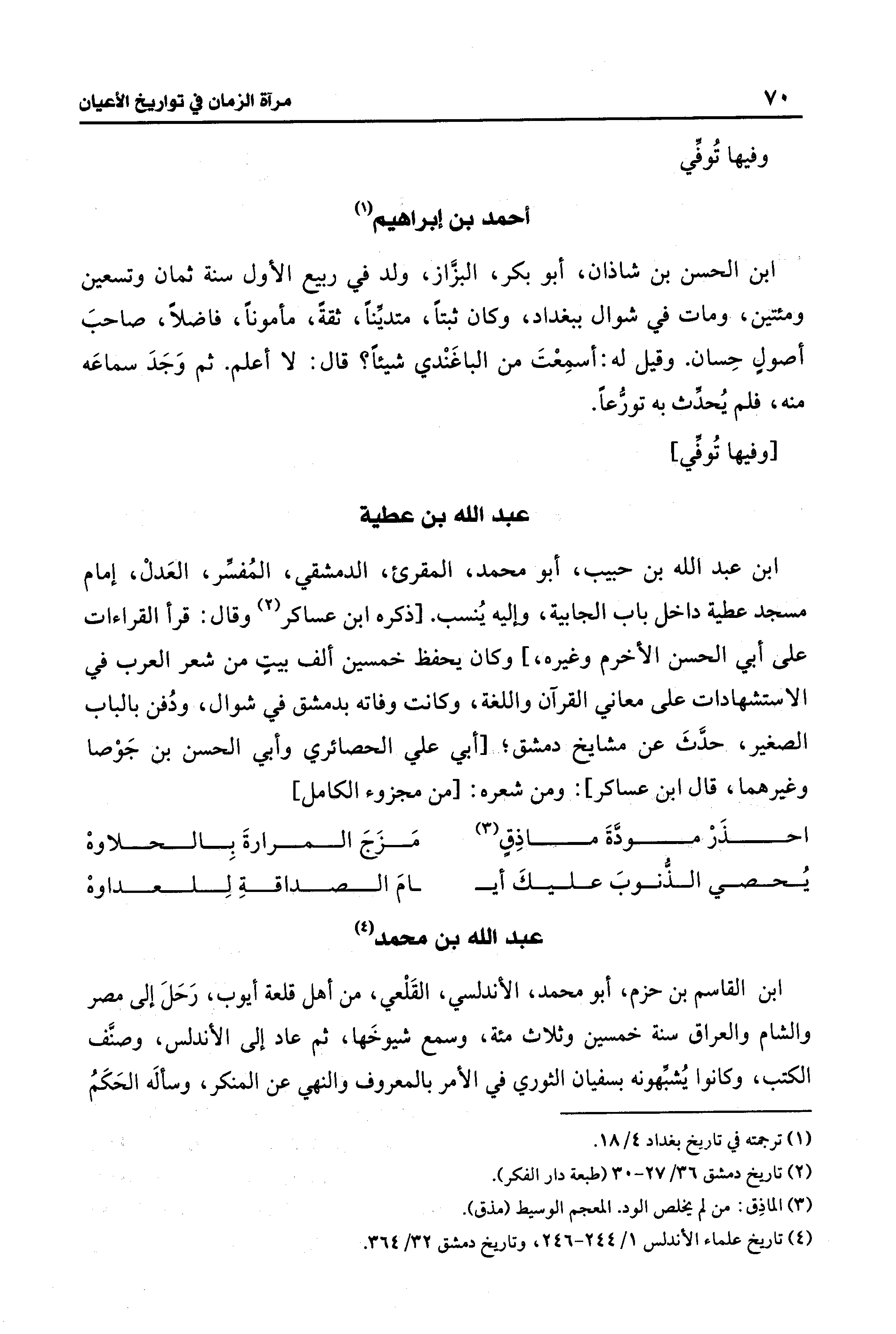 ابن عبد الله بن حبيب، أبو محمد، المقرئ، الدمشقي، المُفسِّر، العَدلْ، إمام مسجد عطية داخل باب الجابية، وإليه يُنسب. [ذكره ابن عساكر (¬2) وقال: قرأ القراءات على أبي الحسن الأخرم وغيره، ] وكان يحفظ خمسين ألف بيتِ من شعر العرب في الاستشهادات على معاني القرآن واللغة، وكانت وفاته بدمشق في شوال، ودُفن بالباب الصغير، حدَّثَ عن مشايخ دمشق؛ [أبي علي الحصائري وأبي الحسن بن جَوْصا وغيرهما، قال ابن عساكر]: ومن شعره: [من مجزوء الكامل]