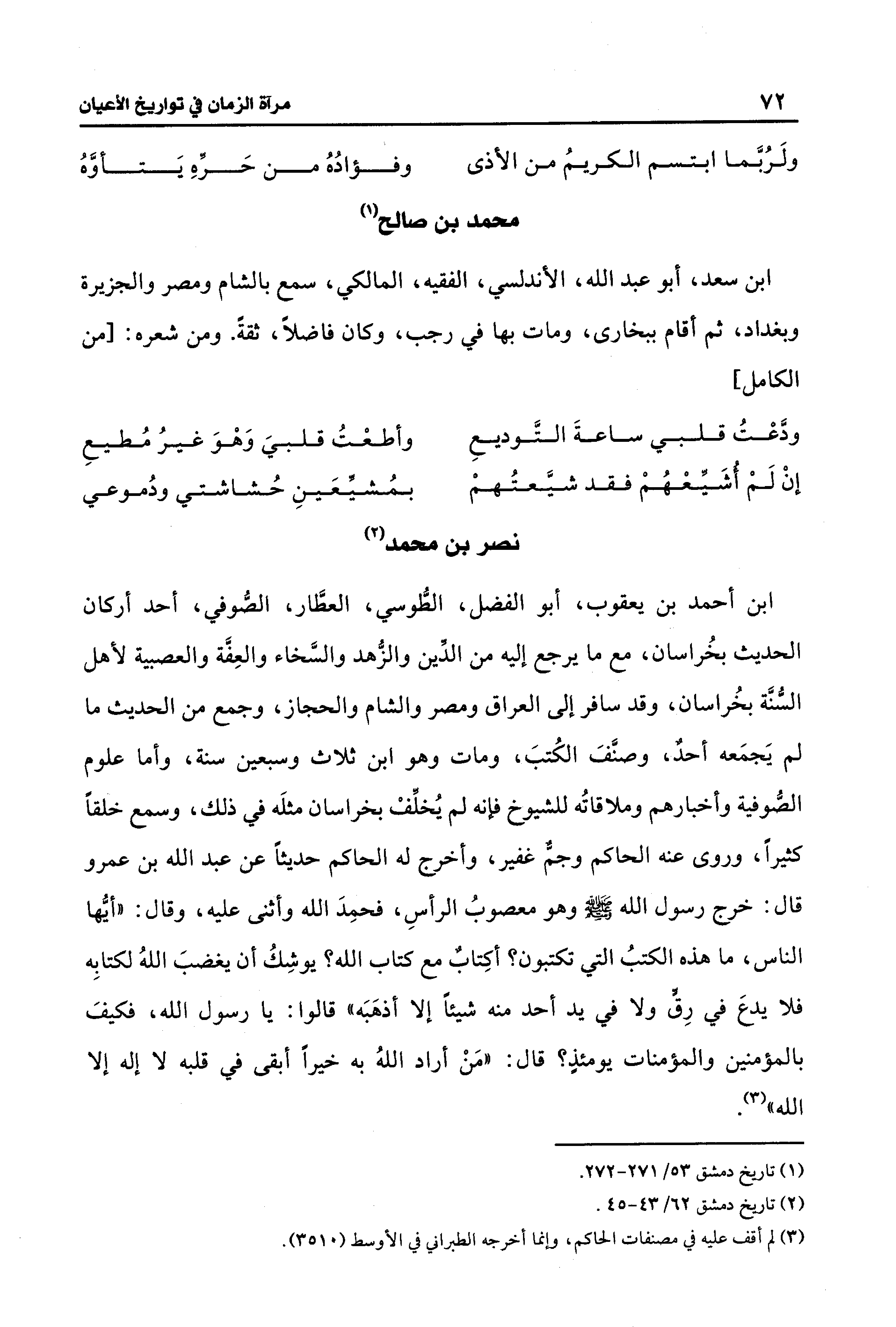 ابن أحمد بن يعقوب، أبو الفضل، الطُّوسي، العطَّار، الصُّوفي، أحد أركان الحديث بخُراسان، مع ما يرجع إليه من الدِّين والزُّهد والسَّخاء والعِفَّة والعصبية لأهل السُّنَّة بخُراسان، وقد سافر إلى العراق ومصر والشام والحجاز، وجمع من الحديث ما لم يَجمَعه أحدٌ، وصنَّفَ الكُتبَ، ومات وهو ابن ثلاث وسبعين سنة، وأما علوم الصُّوفية وأخبارهم وملاقاتُه للشيوخ فإنه لم يُخلِّفْ بخراسان مثلَه في ذلك، وسمع خلقًا كثيرًا، وروى عنه الحاكم وجمٌّ غفير، وأخرج له الحاكم حديثًا عن عبد الله بن عمرو قال: خرج رسول الله - صلى الله عليه وسلم - وهو معصوبُ الرأسِ، فحمِدَ الله وأثنى عليه، وقال: "أيُّها الناس، ما هذه الكتبُ التي تكتبون؟ أكِتابٌ مع كتاب الله؟ يوشِكُ أن يغضبَ اللهُ لكتابِه فلا يدعَ في رِقٍّ ولا في يد أحد منه شيئًا إلا أذهَبَه" قالوا: يا رسول الله، فكيفَ بالمؤمنين والمؤمنات يومئذٍ؟ قال: "مَنْ أراد اللهُ به خيرًا أبقى في قلبه لا إله إلا الله" (¬3).