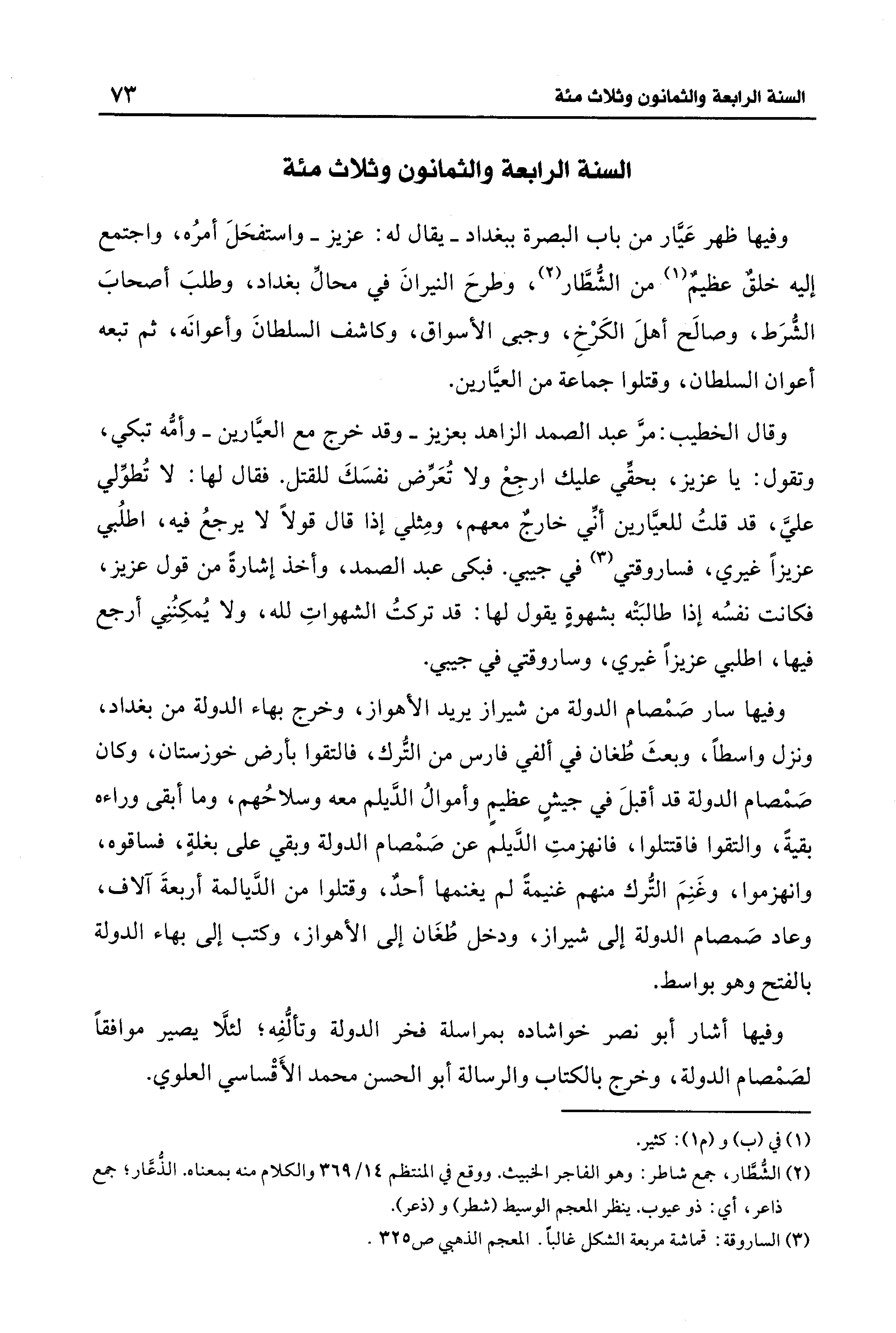 وفيها ظهر عَيَّار من باب البصرة ببغداد -يقال له: عزيز- واستفحَلَ أمرُه، واجتمع إليه خلقٌ عظيمٌ (¬1) من الشُّطَّار (¬2)، وطرحَ النيرانَ في محالِّ بغداد، وطلبَ أصحابَ الشُّرَط، وصالح أهلَ الكَرْخِ، وجبى الأسواق، وكاشف السلطانَ وأعوانَه، ثم تبعه أعوان السلطان، وقتلوا جماعة من العيَّارين.