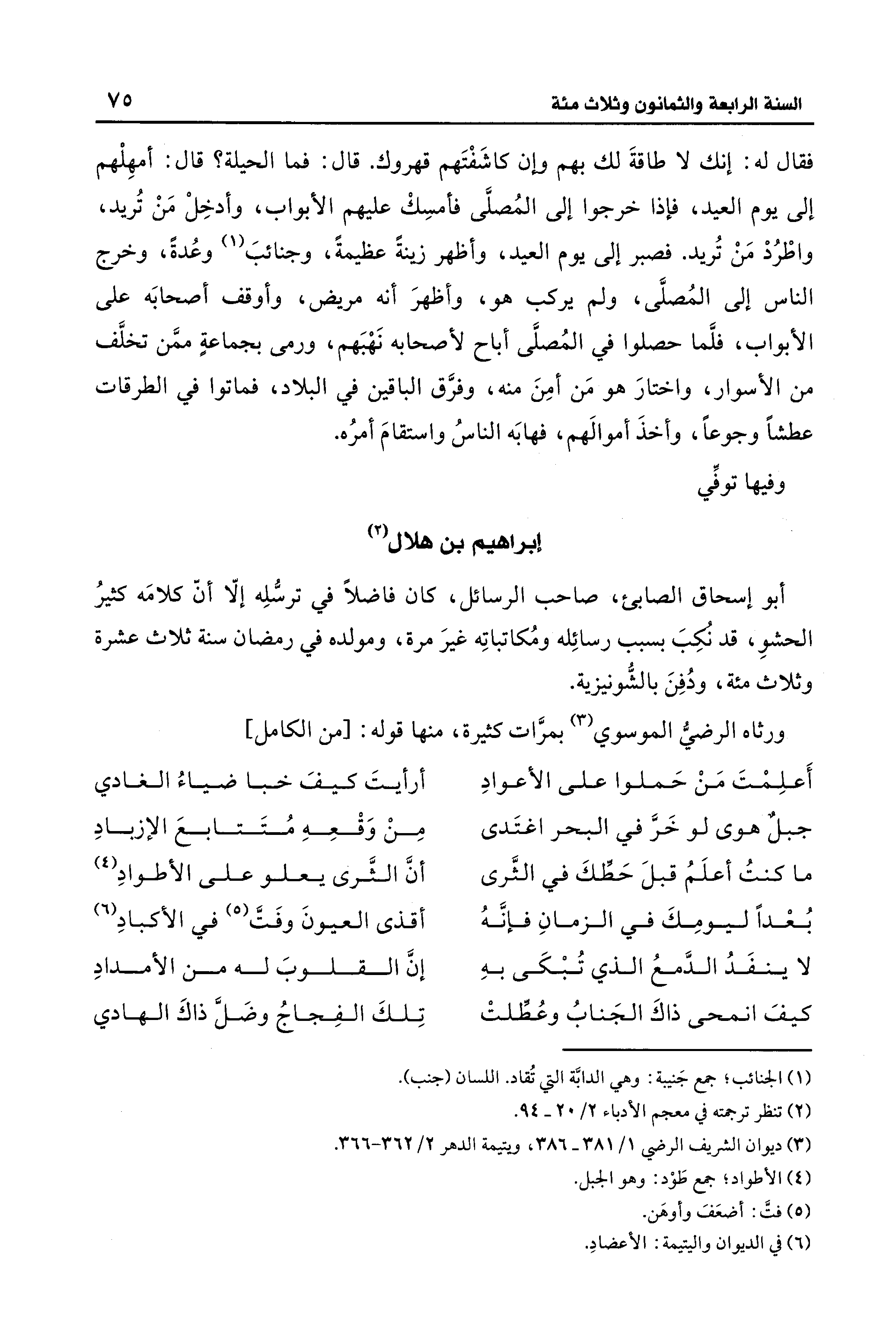 أبو إسحاق الصابئ، صاحب الرسائل، كان فاضلًا في ترسُّلِه إلّا أنّ كلامَه كثيرُ الحشو، قد نُكِبَ بسبب رسائِله ومُكاتباتِه غيرَ مرة، ومولده في رمضان سنة ثلاث عشرة وثلاث مئة، ودُفِنَ بالشُّونيزية.