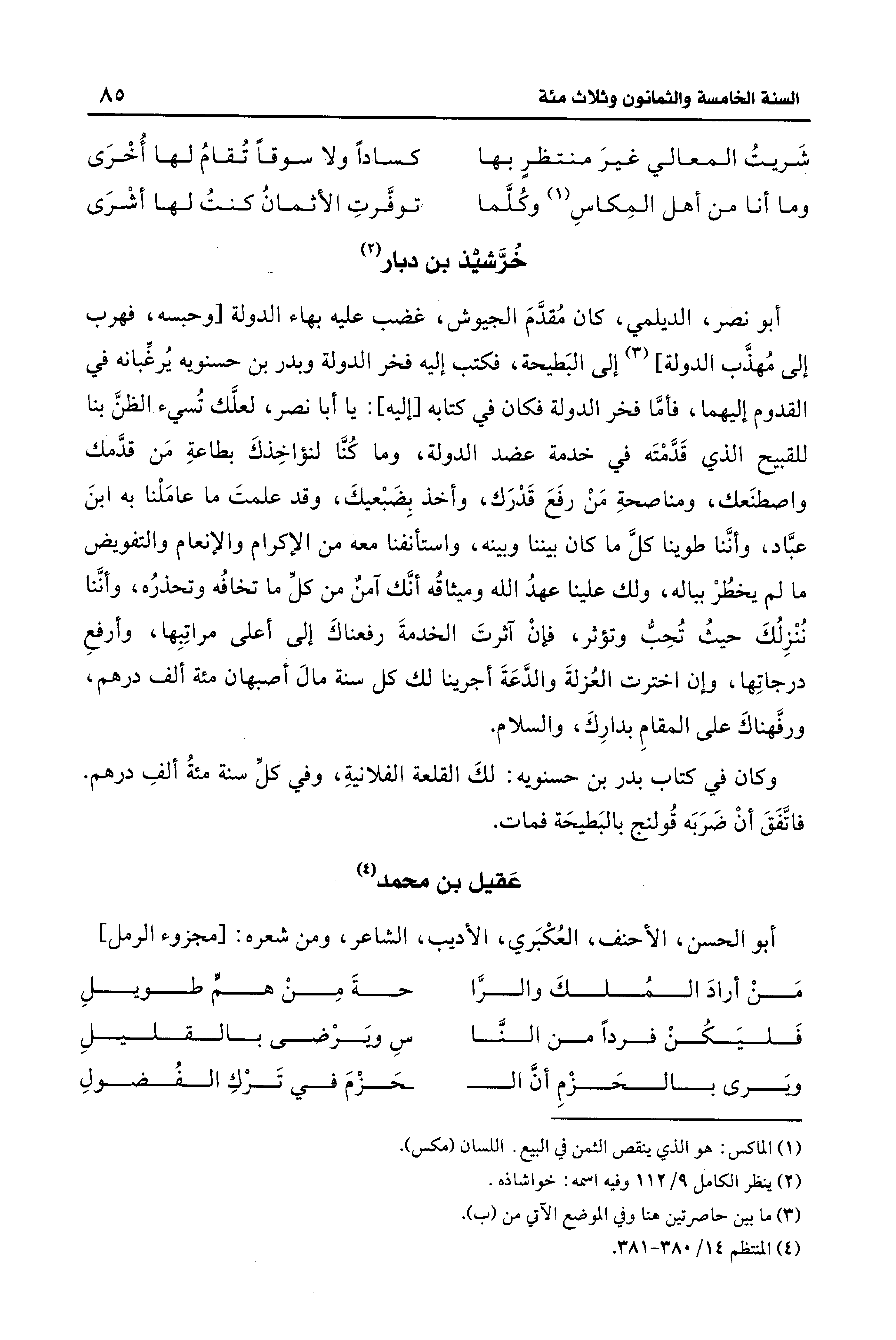 أبو نصر، الديلمي، كان مُقدَّمَ الجيوش، غضب عليه بهاء الدولة [وحبسه، فهرب إلى مُهذَّب الدولة] (¬3) إلى البَطيحة، فكتب إليه فخر الدولة وبدر بن حسنويه يُرغِّبانه في القدوم إليهما، فامَّا فخر الدولة فكان في كتابه [إليه]: يا أبا نصر، لعلَّك تُسيء الظنَّ بنا للقبيح الَّذي قَدَّمْتَه في خدمة عضد الدولة، وما كُنَّا لنؤاخِذكَ بطاعةِ مَن قدَّمك واصطنَعك، ومناصحةِ مَنْ رفَعَ قَدْرَك، وأخذ بِضَبْعيكَ، وقد علمتَ ما عامَلْنا به ابنَ عبَّاد، وأنَّنا طوينا كلَّ ما كان بيننا وبينه، واستأنفنا معه من الإكرام والإنعام والتفويض ما لم يخطُرْ بباله، ولك علينا عهدُ الله وميثاقُه أنَّك آمنٌ من كلِّ ما تخافُه وتحذرُه، وأنَّنا نُنْزِلُكَ حيثُ تُحِبُّ وتؤثر، فإنْ آثرتَ الخدمةَ رفعناكَ إلى أعلى مراتِبِها، وأرفعِ درجاتِها، وإن اخترت العُزلةَ والدَّعَةَ أجرينا لك كل سنة مال أصبهان مئة ألف درهم، ورفَّهناكَ على المقامِ بدارِكَ، والسلام.