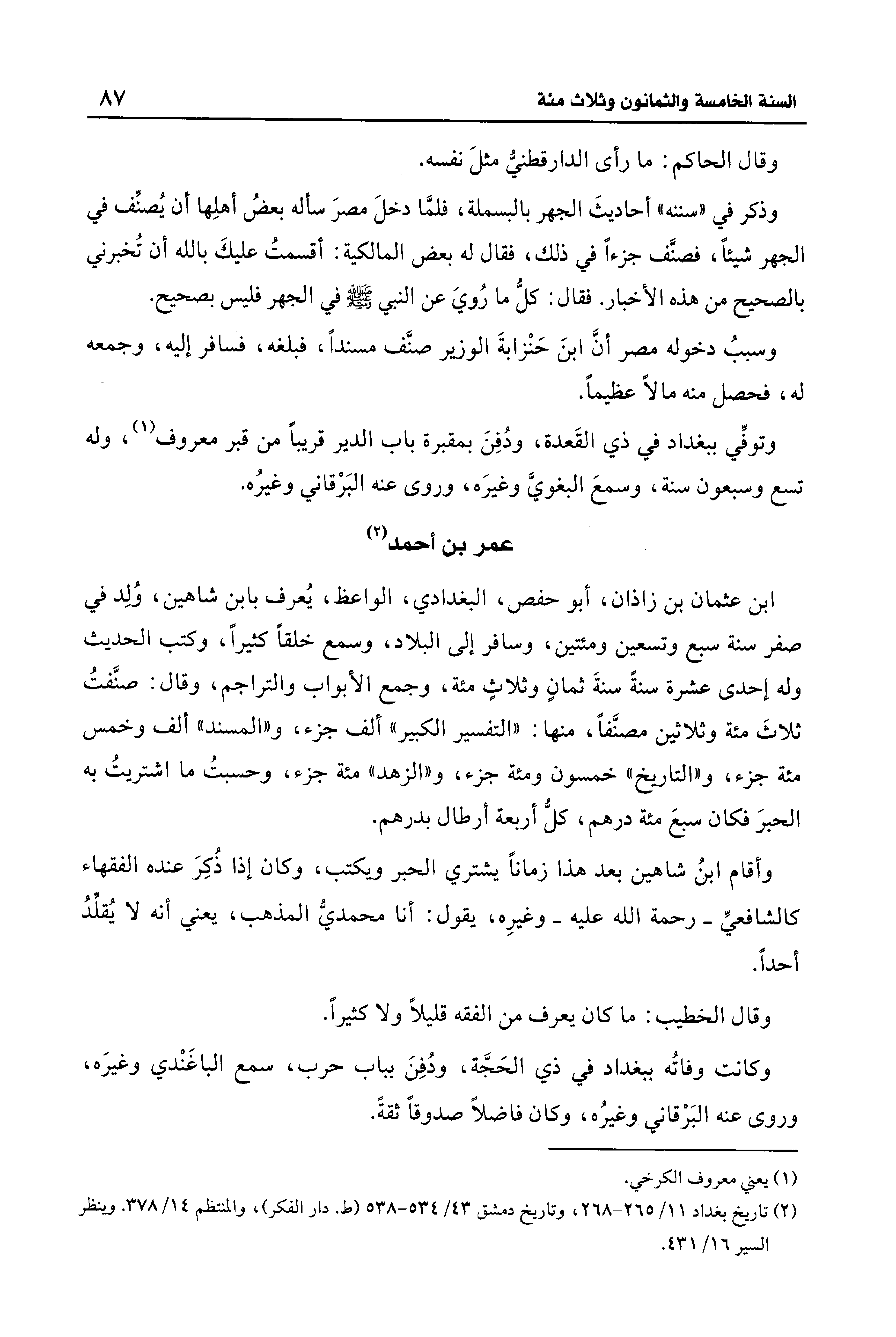 ابن عثمان بن زاذان، أبو حفص، البغدادي، الواعظ، يُعرف بابن شاهين، وُلِد في صفر سنة سبع وتسعين ومئتين، وسافر إلى البلاد، وسمع خلقًا كثيرًا، وكتب الحديث وله إحدى عشرة سنة سنةَ ثمانٍ وثلاثٍ مئة، وجمع الأبواب والتراجم، وقال: صنَّفتُ ثلاثَ مئة وثلاثين مصنَّفًا، منها: "التفسير الكبير" ألف جزء، و"المسند" ألف وخمس مئة جزء، و"التاريخ" خمسون ومئة جزء، و"الزهد" مئة جزء، وحسبتُ ما اشتريتُ به الحبرَ فكان سبعَ مئة درهم، كلُّ أربعة أرطال بدرهم.