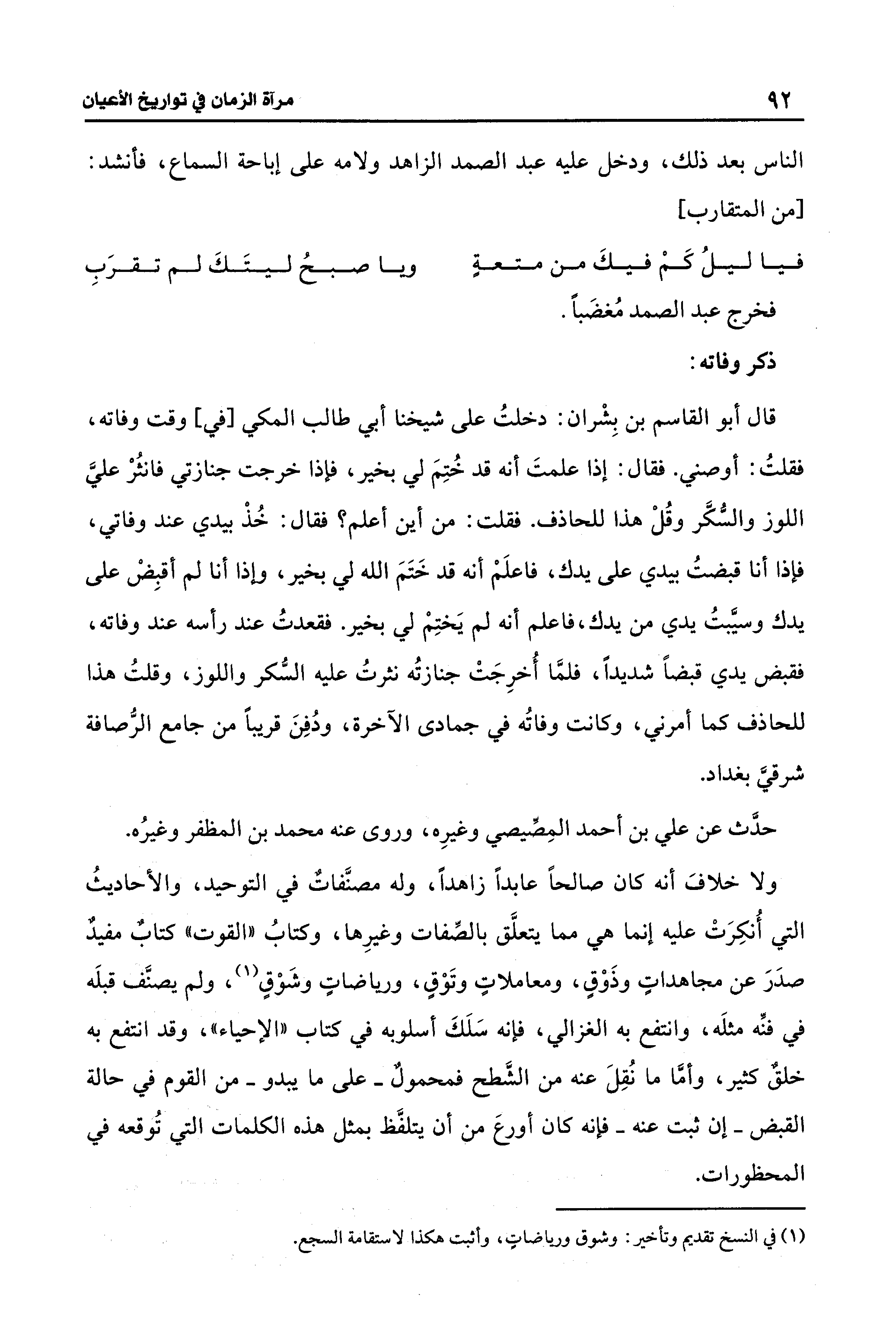 ولا خلافَ أنَّه كان صالحًا عابدًا زاهدًا، وله مصنَّفاتٌ في التوحيد، والأحاديثُ التي أُنكِرَتْ عليه إنما هي مما يتعلَّق بالصِّفات وغيرِها، وكتابُ "القوت" كتابٌ مفيدٌ صدَرَ عن مجاهداتٍ وذَوْقٍ، ومعاملاتٍ وتَوْقٍ، ورياضاتٍ وشَوْقٍ (¬1)، ولم يصنَّف قبلَه في فنِّه مثلَه، وانتفع به الغزالي، فإنه سَلَكَ أسلوبه في كتاب "الإحياء"، وقد انتفع به خلق كثير، وأمَّا ما نُقِلَ عنه من الشَّطح فمحمولٌ -على ما يبدو- من القوم في حالة القبض -إن ثبت عنه- فإنه كان أورعَ من أن يتلفَّظ بمثل هذه الكلمات التي تُوقعه في المحظورات.