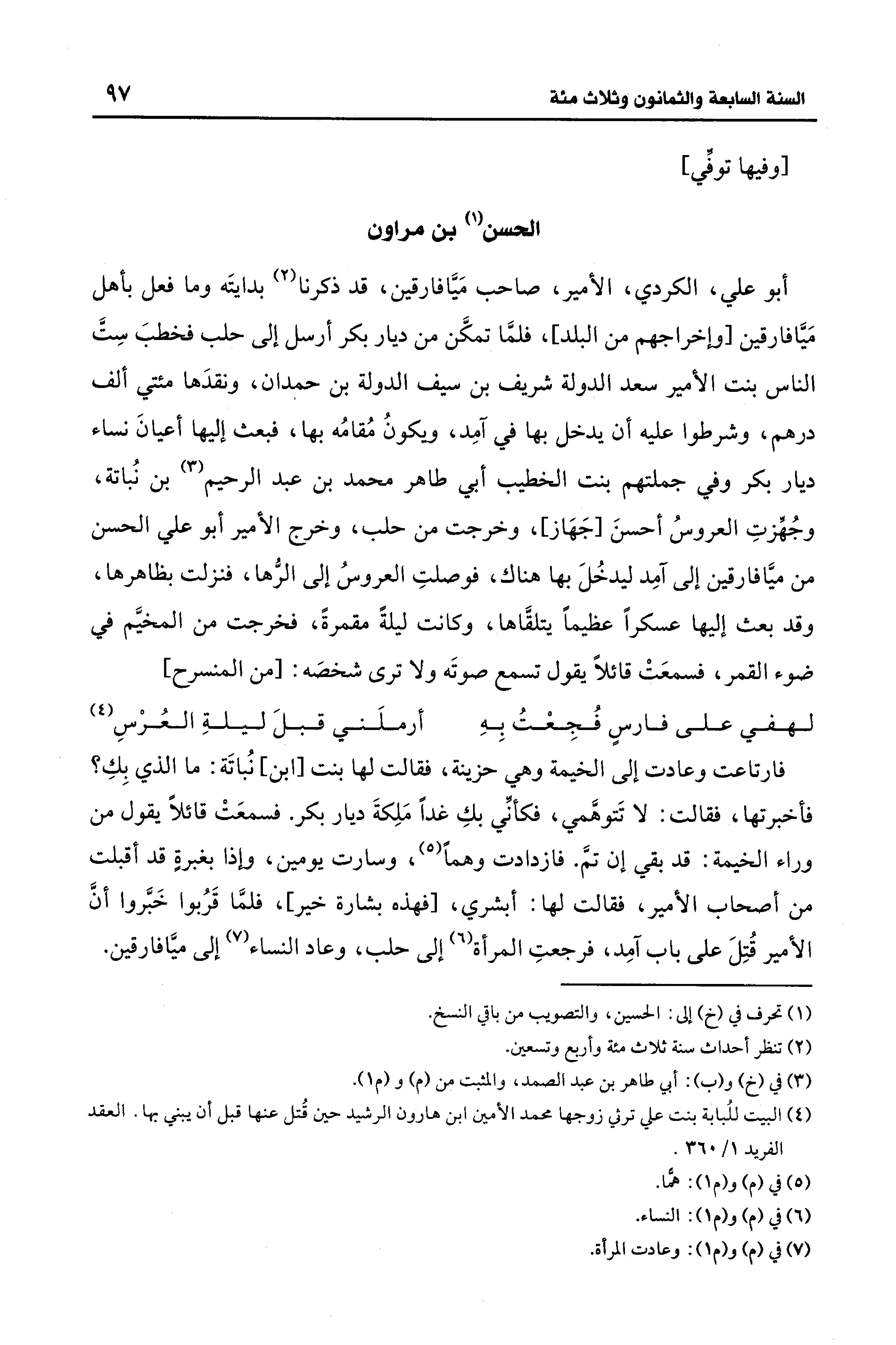 أبو علي، الكردي، الأمير، صاحب مَيَّافارقين، قد ذكرنا (¬2) بدايتَه وما فعل بأهل مَيَّافارقين [وإخراجهم من البلد]، فلمَّا تمكَّن من ديار بكر أرسل إلى حلب فخطبَ سِتَّ الناس بنت الأمير سعد الدولة شريف بن سيف الدولة بن حمدان، ونقدَها مئتي ألف درهم، وشرطوا عليه أن يدخل بها في آمِد، ويكونُ مُقامُه بها، فبعث إليها أعيانَ نساء ديار بكر وفي جملتهم بنت الخطيب أبي طاهر محمد بن عبد الرحيم (¬3) بن نُباتة، وجُهِّزتِ العروسُ أحسنَ [جَهاز]، وخرجت من حلب، وخرج الأمير أبو علي الحسن من ميَّافارقين إلى آمِد ليدخُلَ بها هناك، فوصلتِ العروسُ إلى الرُّها، فنزلت بظاهرها، وقد بعث إليها عسكرًا عظيمًا يتلقَّاها، وكانت ليلةً مقمرةً، فخرجت من المخيَّم في ضوء القمر، فسمعَتْ قائلًا يقول تسمع صوتَه ولا ترى شخصَه: [من المنسرح]