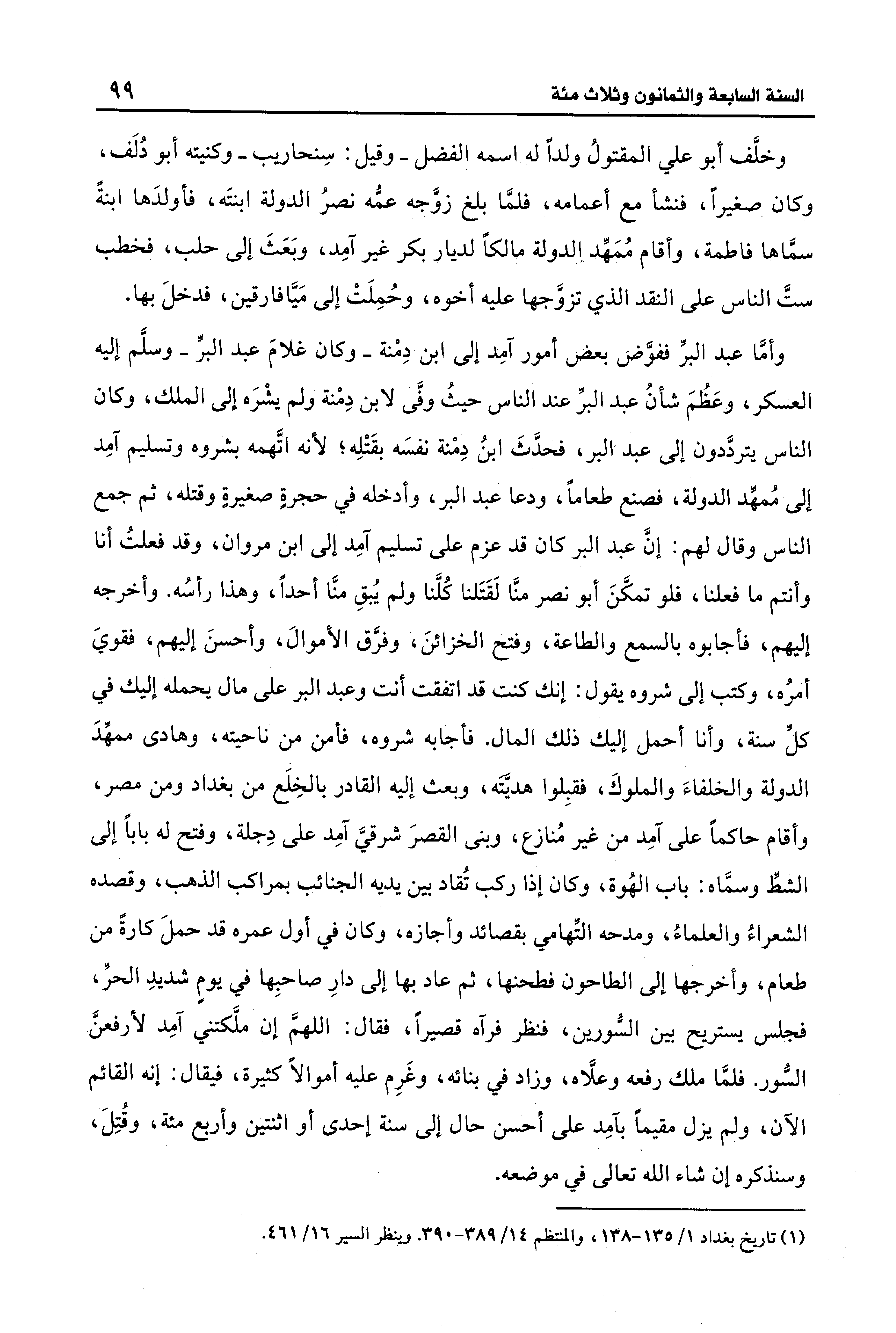 وأمَّا عبد البرِّ ففوَّض بعض أمور آمِد إلى ابن دِمنة -وكان غلامَ عبد البرِّ- وسلَّم إليه العسكر، وعَظُمَ شأنُ عبد البرّ عند الناس حيثُ وفَّى لابن دِمْنة ولم يشْرَه إلى الملك، وكان الناس يتردَّدون إلى عبد البر، فحدَّثَ ابنُ دِمْنة نفسَه بقَتْلِه؛ لأنه اتَّهمه بشروه وتسليم آمِد إلى مُمهِّد الدولة، فصنع طعامًا، ودعا عبد البر، وأدخله في حجرةٍ صغيرةٍ وقتله، ثم جمع الناس وقال لهم: إنَّ عبد البر كان قد عزم على تسليم آمِد إلى ابن مروان، وقد فعلتُ أنا وأنتم ما فعلنا، فلو تمكَنَ أبو نصر منَّا لَقَتَلنا كُلَّنا ولم يُبقِ منَّا أحدًا، وهذا رأسُه. وأخرجه إليهم، فأجابوه بالسمع والطاعة، وفتح الخزائنَ، وفرَّق الأموال، وأحسنَ إليهم، فقويَ أمرُه، وكتب إلى شروه يقول: إنك كنت قد اتفقت أنت وعبد البر على مال يحمله إليك في كلِّ سنة، وأنا أحمل إليك ذلك المال. فأجابه شروه، فأمن من ناحيته، وهادى ممهِّدَ الدولة والخلفاءَ والملوكَ، فقبِلوا هديّتَه، وبعث إليه القادر بالخِلَع من بغداد ومن مصر، وأقام حاكمًا على آمِد من غير مُنازع، وبنى القصرَ شرقيَّ آمِد على دِجلة، وفتح له بابًا إلى الشطِّ وسمَّاه: باب الهُوة، وكان إذا ركب تُقاد بين يديه الجنائب بمراكب الذهب، وقصده الشعراءُ والعلماءُ، ومدحه التِّهامي بقصائد وأجازه، وكان في أول عمره قد حملَ كارةً من طعام، وأخرجها إلى الطاحون فطحنها، ثم عاد بها إلى دارِ صاحبِها في يومٍ شديدِ الحرِّ، فجلس يستريح بين السُّورين، فنظر فرآه قصيرًا، فقال: اللهمَّ إن ملَّكتني آمِد لأرفعنَّ السُّور. فلمَّا ملك رفعه وعلَّاه، وزاد في بنائه، وغَرِم عليه أموالًا كثيرة، فيقال: إنه القائم الآن، ولم يزل مقيمًا بآمِد على أحسن حال إلى سنة إحدى أو اثنتين وأربع مئة، وقُتِلَ، وسنذكره إن شاء الله تعالى في موضعه.