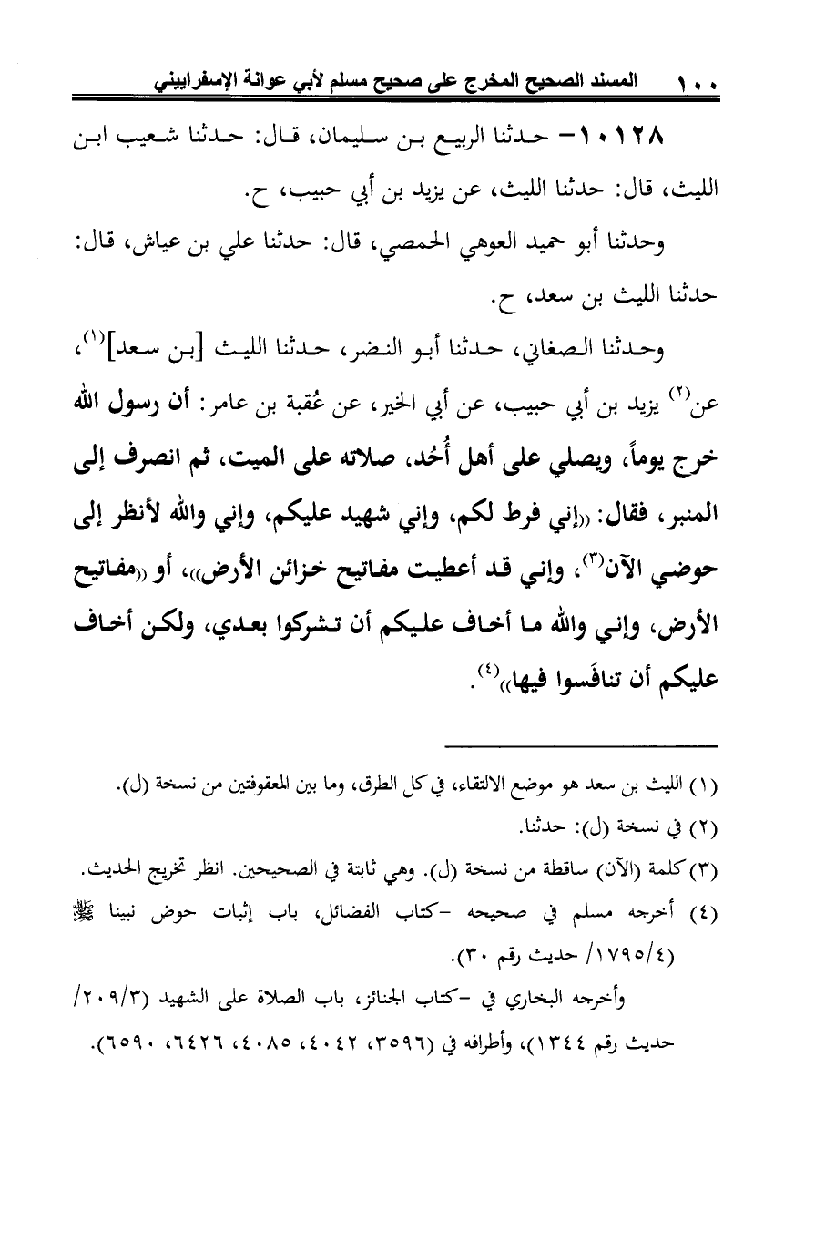 وحدثنا الصغاني، حدّثنا أبو النضر، حدّثنا اللَّيث [بن سعد] (¬1)، عن (¬2) يزيد بن أبي حبيب، عن أبي الخير، عن عُقبة بن عامر: أن رسول الله خرج يومًا، ويصلّي على أهل أُحُد، صلاته على الميِّت، ثمّ انصرف إلى المنبر، فقال: "إني فرط لكم، وإني شهيد عليكم، وإني والله لأنظر إلى حوضي الآن (¬3)، وإني قد أعطيت مفاتيح خزائن الأرض"، أو "مفاتيح الأرض، وإني والله ما أخاف عليكم أن تشركوا بعدي، ولكن أخاف عليكم أن تنافَسوا فيها" (¬4).