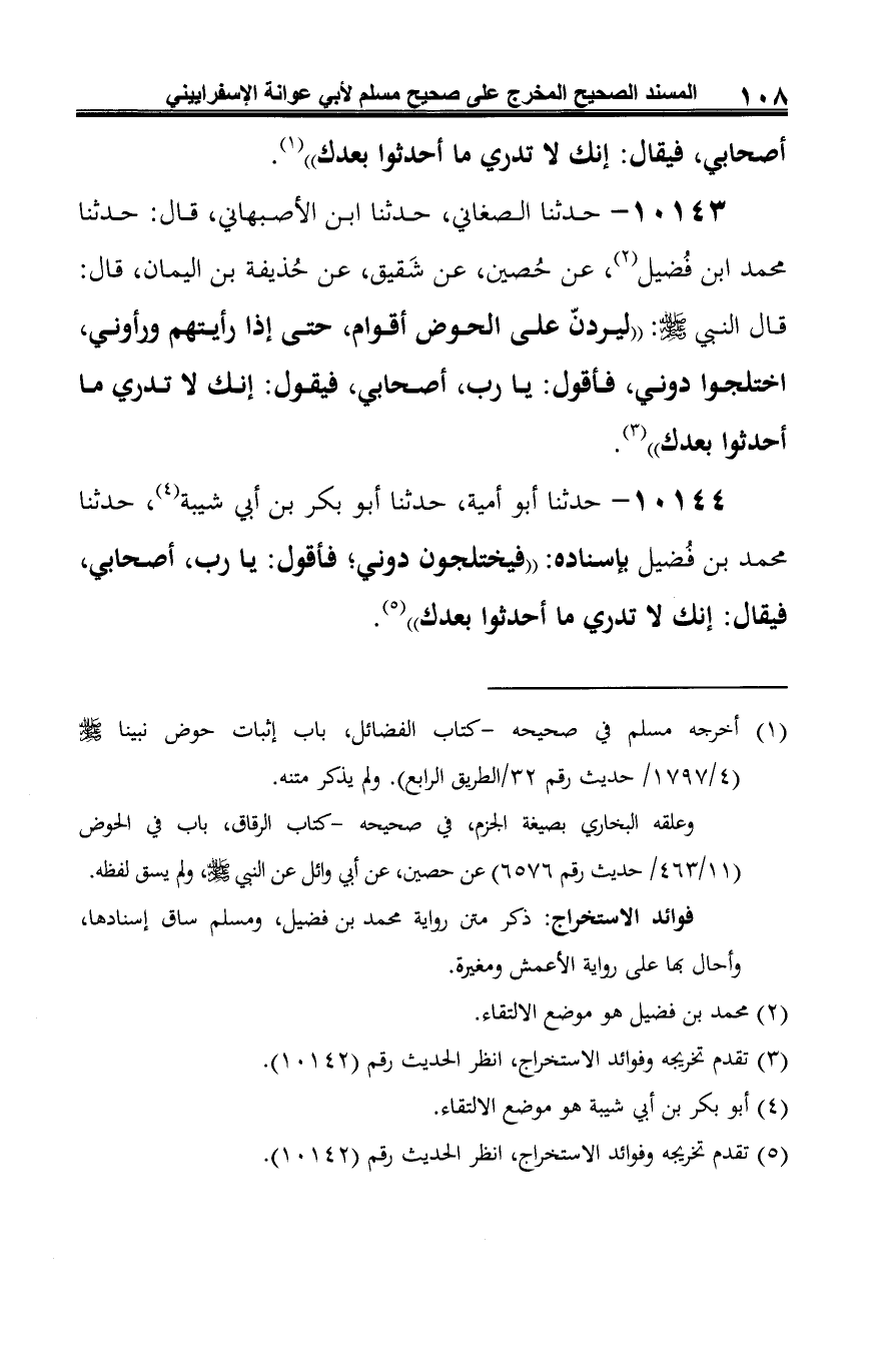 10143 - حدّثنا الصغاني، حدّثنا ابن الأصبهاني، قال: حدّثنا محمّد ابن فُضيل (¬1)، عن حُصين، عن شَقيق، عن حُذيفة بن اليمان، قال: قال النبي -صلى الله عليه وسلم-: "ليردنّ على الحوض أقوام، حتّى إذا رأيتهم ورأوني، اختلجوا دوني، فأقول: يا رب، أصحابي، فيقول: إنك لا تدري ما أحدثوا بعدك" (¬2).