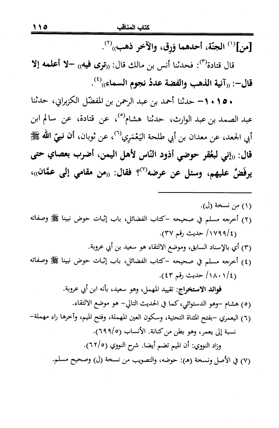 10150 - حدّثنا أحمد بن عبد الرّحمن بن المفضّل الكزبراني، حدّثنا عبد الصمد بن عبد الوارث، حدّثنا هشام (¬1)، عن قتادة، عن سالم ابن أبي الجعد، عن معدان بن أبي طلحة اليَعْمَرِي (¬2)، عن ثوبان، أن نبيّ الله -صلى الله عليه وسلم- قال: "إنِّي لبعُقر حوضي أذود النَّاس لأهل اليمن، أضرب بعصاي حتّى يرفَضَّ عليهم، وسئل عن عرضه (¬3)؟ فقال: "من مقامي إلى عمَّان"،
