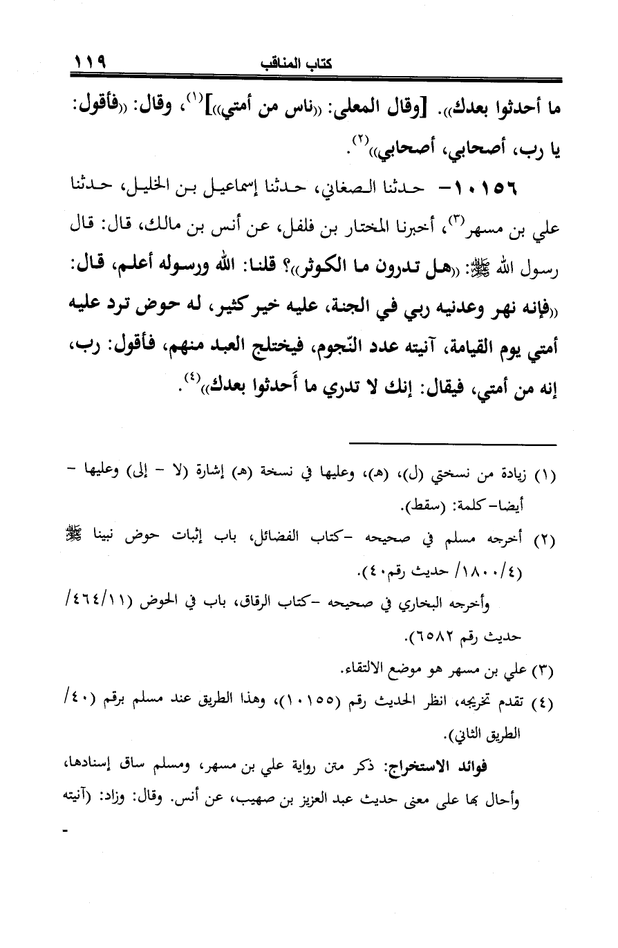 10156 - حدّثنا الصغاني، حدّثنا إسماعيل بن الخليل، حدّثنا علي بن مسهر (¬1)، أخبرنا المختار بن فلفل، عن أنس بن مالك، قال: قال رسول الله -صلى الله عليه وسلم-: "هل تدرون ما الكوثر"؟ قلنا: الله ورسوله أعلم، قال: "فإنّه نهر وعدنيه ربي في الجنَّة، عليه خير كثير، له حوض ترد عليه أمتي يوم القيامة، آنيته عدد النّجوم، فيختلج العبد منهم، فأقول: رب، إنّه من أمتي، فيقال: إنك لا تدري ما أَحدثوا بعدك" (¬2).