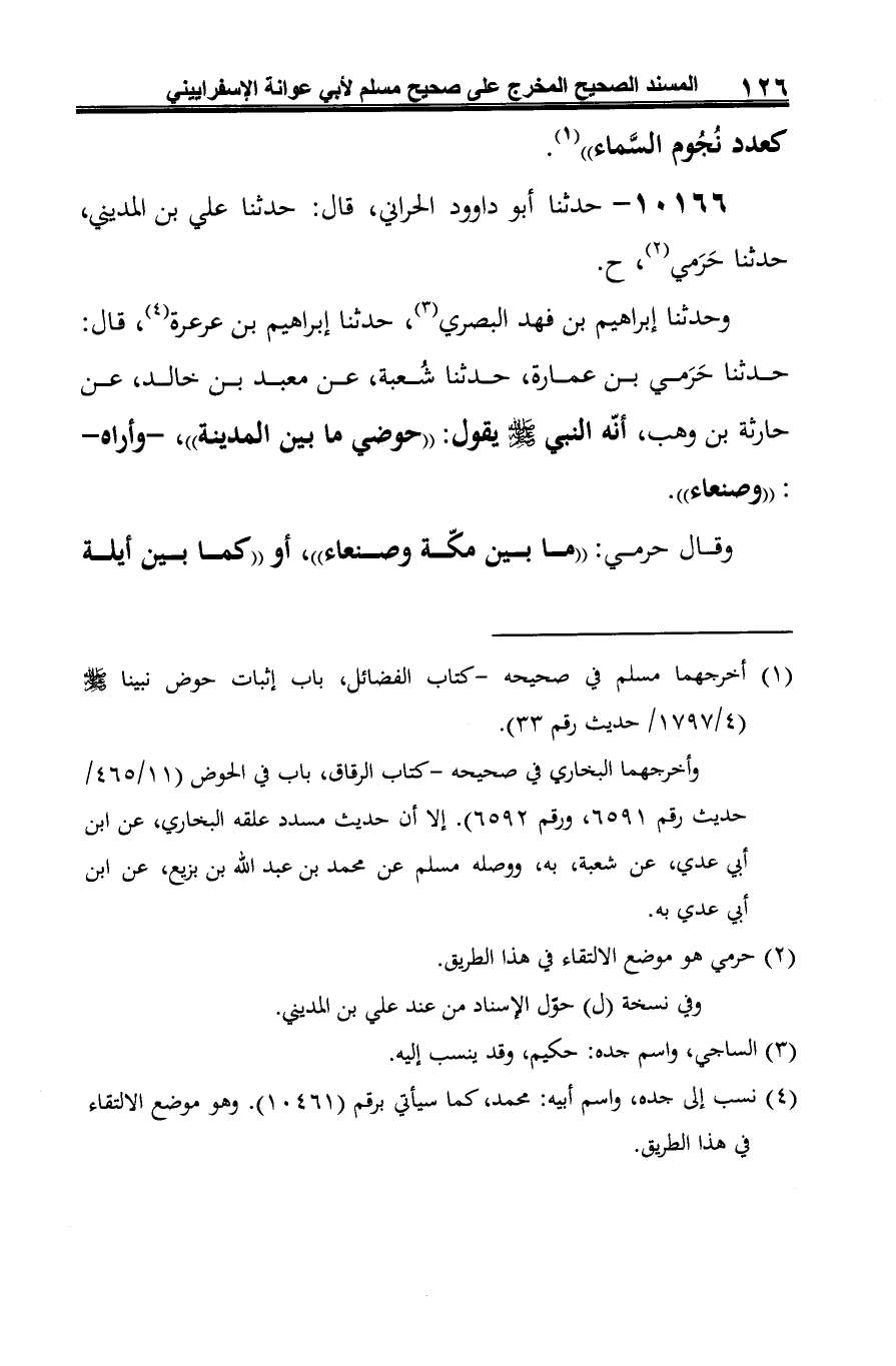 وحدثنا إبراهيم بن فهد البصري (¬2)، حدّثنا إبراهيم بن عرعرة (¬3)، قال: حدّثنا حَرَمى بن عمارة، حدّثنا شُعبة، عن معبد بن خالد، عن حارثة بن وهب، أنه النّبيّ -صلى الله عليه وسلم- يقول: "حوضي ما بين المدينة"، -وأراه-: "وصنعاء".