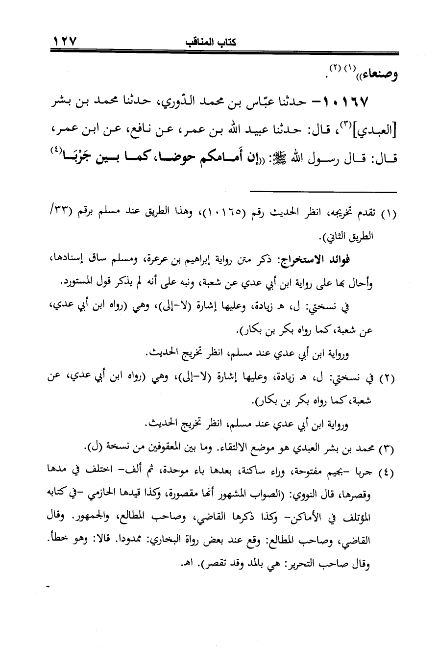 10167 - حدّثنا عبّاس بن محمّد الدّوري، حدّثنا محمّد بن بشر [العبدي] (¬1)، قال: حدّثنا عبيد الله بن عمر، عن نافع، عن ابن عمر، قال: قال رسول الله -صلى الله عليه وسلم-: "إن أَمامكم حوضا، كما بين جَرْبَا (¬2)