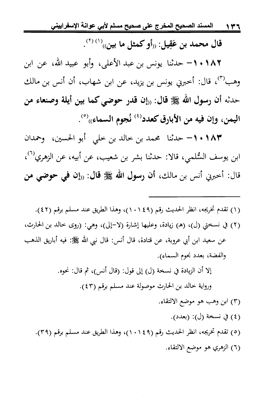 10183 - حدّثنا محمّد بن خالد بن خلي أبو الحسين، وحمدان ابن يوسف السُّلمي، قالا: حدّثنا بشر بن شعيب، عن أبيه، عن الزّهريّ (¬1)، قال: أخبرني أنس بن مالك، أن رسول الله -صلى الله عليه وسلم- قال: "إن في حوضي من