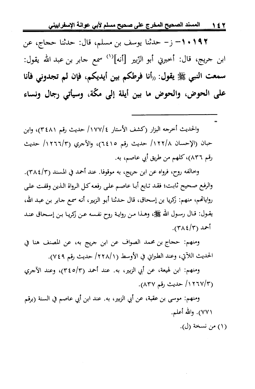 10192 - ز- حدّثنا يوسف بن مسلم، قال: حدّثنا حجاج، عن ابن جريج، قال: أخبرني أبو الزّبير [أنه] (¬1) سمع جابر بن عبد الله يقول: سمعت النّبيّ -صلى الله عليه وسلم- يقول: "أنا فرطكم بين أيديكم، فإن لم تجدوني فأنا على الحوض، والحوض ما بين أيلة إلى مكّة، وسيأتي رجال ونساء