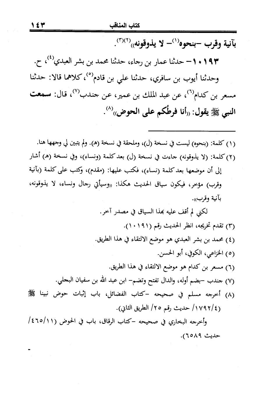 وحدثنا أيوب بن سافري، حدّثنا علي بن قادم (¬2)، كلاهما قالا: حدّثنا مسعر بن كدام (¬3)، عن عبد الملك بن عمير، عن جندب (¬4)، قال: سمعت النّبيّ -صلى الله عليه وسلم- يقول: "أنا فرطكم على الحوض" (¬5).