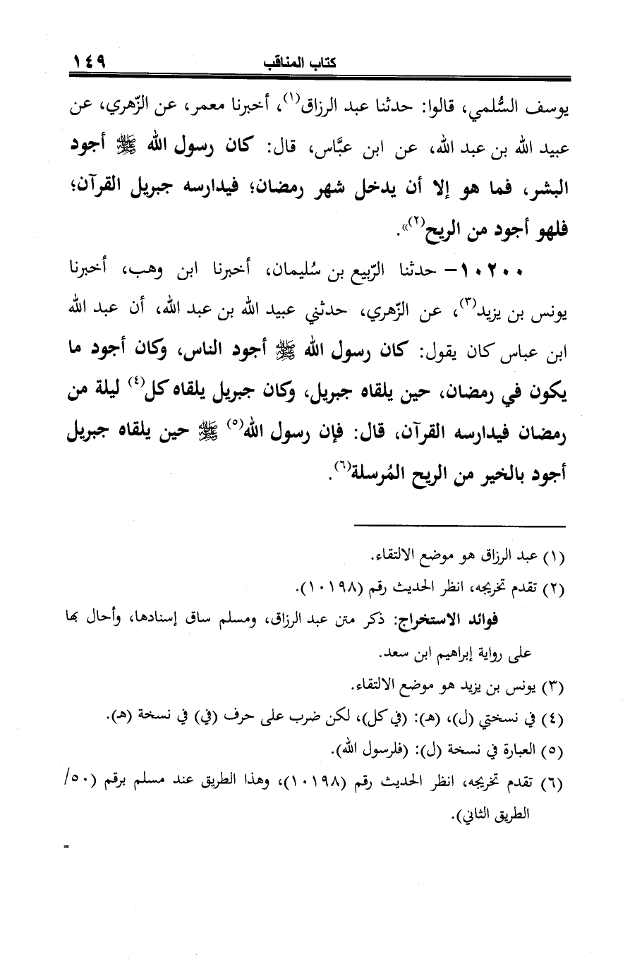 10200 - حدّثنا الرّبيع بن سُليمان، أخبرنا ابن وهب، أخبرنا يونس بن يزيد (¬1)، عن الزّهري، حدثني عبيد الله بن عبد الله، أن عبد الله ابن عبّاس كان يقول: كان رسول الله -صلى الله عليه وسلم- أجود النَّاس، وكان أجود ما يكون في رمضان، حين يلقاه جبريل، وكان جبريل يلقاه كلّ (¬2) ليلة من رمضان فيدارسه القرآن، قال: فإن رسول الله (¬3) -صلى الله عليه وسلم- حين يلقاه جبريل أجود بالخير من الريح المُرسلة (¬4).