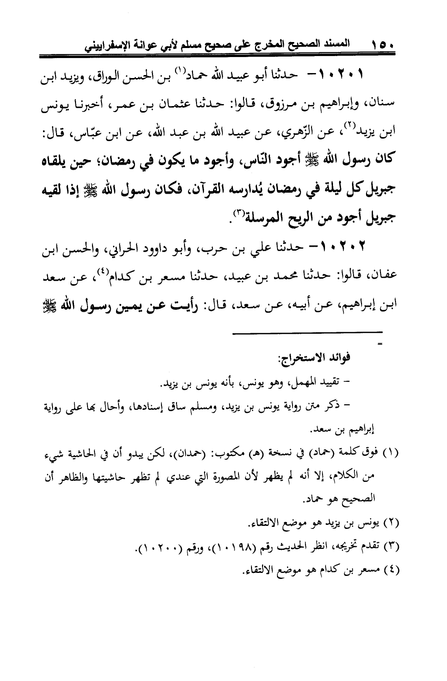 10201 - حدّثنا أبو عبيد الله حماد (¬1) بن الحسن الورَّاق، ويزيد ابن سنان، وإبراهيم بن مرزوق، قالوا: حدّثنا عثمان بن عمر، أخبرنا يونس ابن يزيد (¬2)، عن الزّهري، عن عبيد الله بن عبد الله، عن ابن عبّاس، قال: كان رسول الله -صلى الله عليه وسلم- أجود النّاس، وأجود ما يكون في رمضان، حين يلقاه جبريل كلّ ليلة في رمضان يُدارسه القرآن، فكان رسول الله -صلى الله عليه وسلم- إذا لقيه جبريل أجود من الريح المرسلة (¬3).