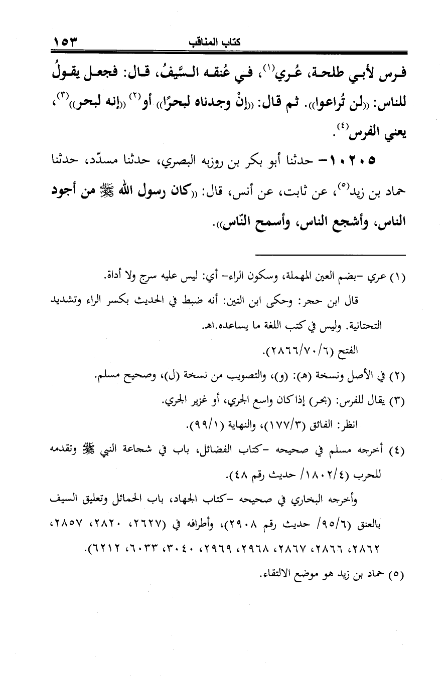10205 - حدّثنا أبو بكر بن روزبه البصري، حدّثنا مسدّد، حدّثنا حماد بن زيد (¬1)، عن ثابت، عن أنس، قال: "كان رسول الله -صلى الله عليه وسلم- من أجود النَّاس، وأشجع النَّاس، وأسمح النَّاس".
