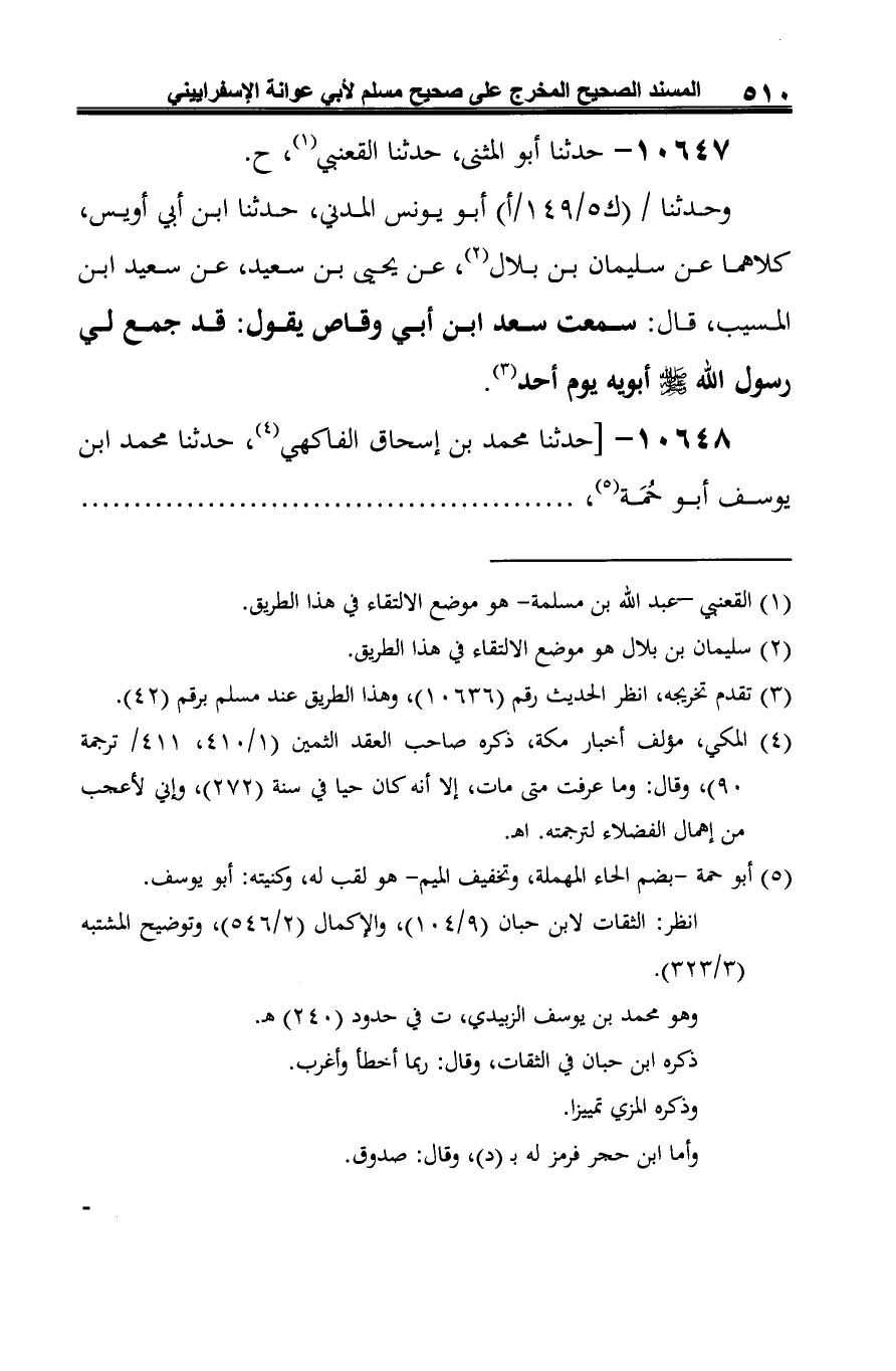 وحدثنا أبو يونس المدني، حدثنا ابن أبي أويس، كلاهما عن سليمان بن بلال (¬2)، عن يحيى بن سعيد، عن سعيد ابن المسيب، قال: سمعت سعد ابن أبي وقاص يقول: قد جمع لي رسول الله -صلى الله عليه وسلم- أبويه يوم أحد (¬3).