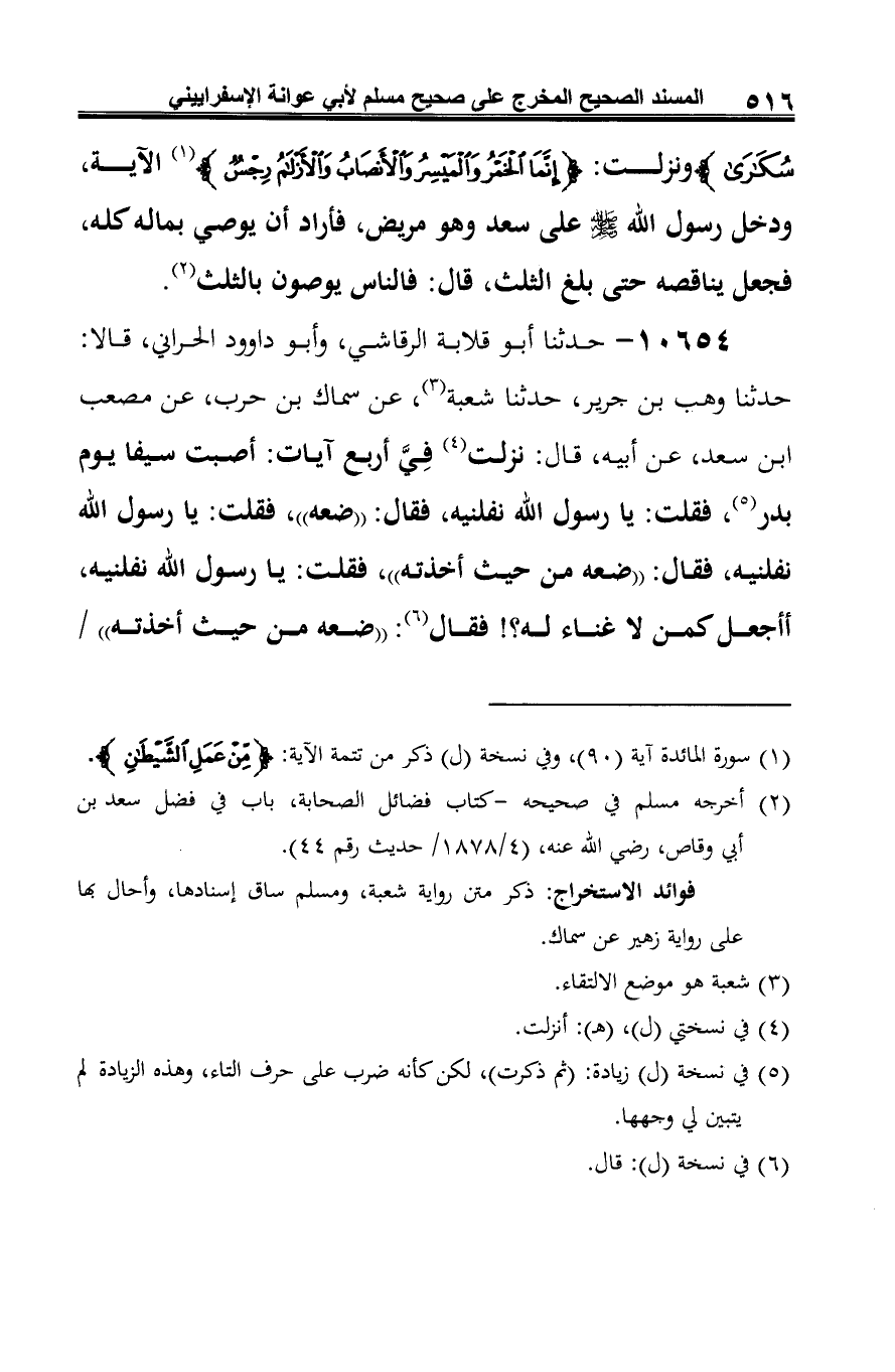 10654 - حدثنا أبو قلابة الرقاشي، وأبو داوود الحراني، قالا: حدثنا وهب بن جرير، حدثنا شعبة (¬1)، عن سماك بن حرب، عن مصعب ابن سعد، عن أبيه، قال: نزلت (¬2) فِيَّ أربع آيات: أصبت سيفا يوم بدر (¬3)، فقلت: يا رسول الله نفلنيه، فقال: "ضعه"، فقلت: يا رسول الله نفلنيه، فقال: "ضعه من حيث أخذته"، فقلت: يا رسول الله نفلنيه، أأجعل كمن لا غناء له؟! فقال (¬4): "ضعه من حيث أخذته"